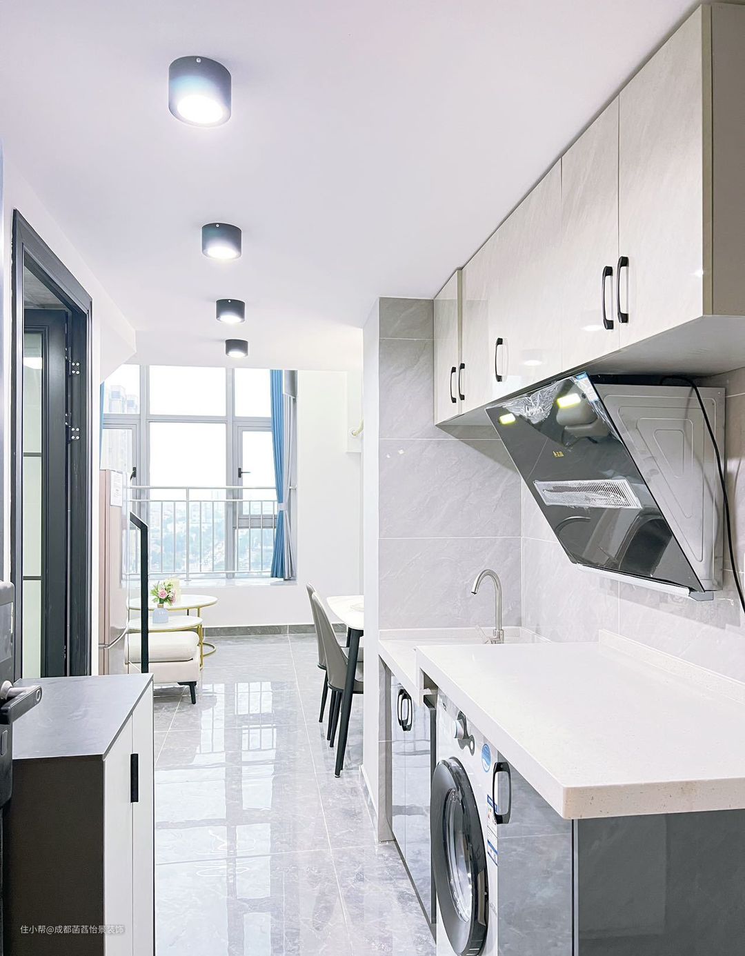 厨房做了定制吊柜,增加收纳。洗衣机嵌入,提升空间整洁度。