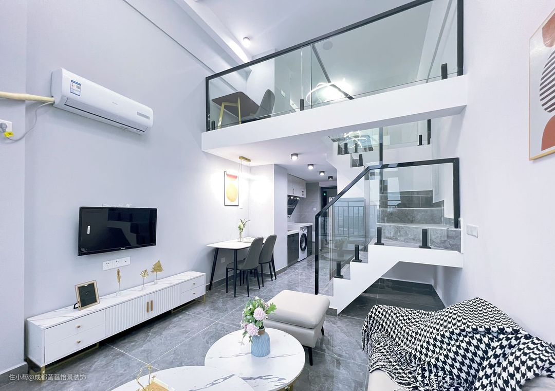 客厅挑空设计,空间更显开阔大气。一字型沙发搭配高低岩板茶几,简约干净。