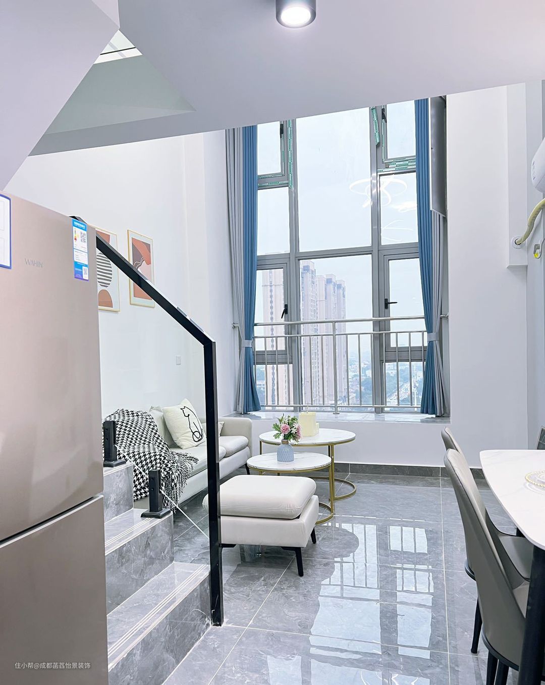 客厅挑空设计,空间更显开阔大气。一字型沙发搭配高低岩板茶几,简约干净。