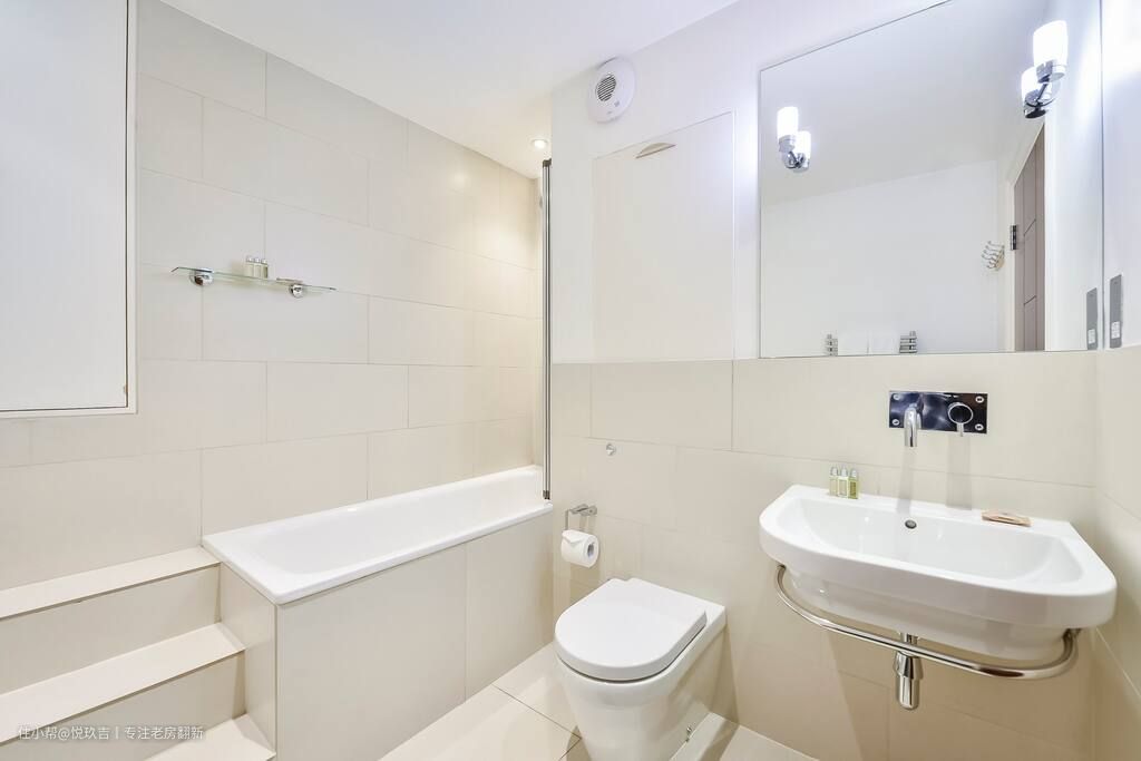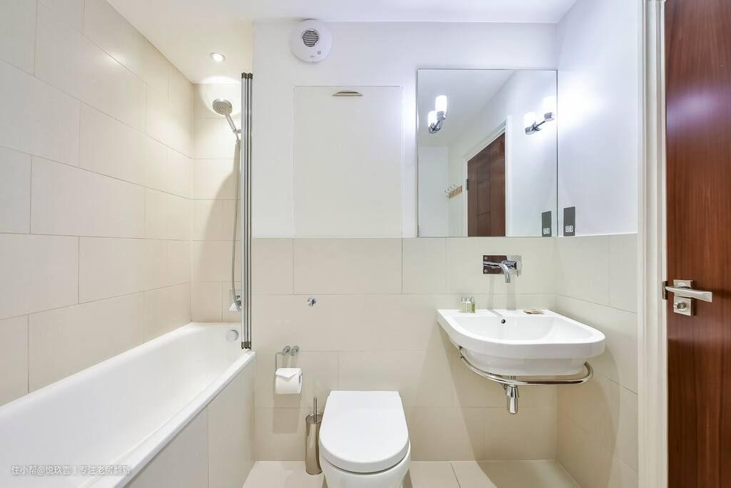 卫生间墙面通铺瓷砖,看起来明亮整洁,地面铺贴防滑瓷砖,保证业主的洗浴安全。卫生间满足了业主的个性化需求,靠墙设计了浴缸。如厕区位于浴缸区的旁边,动线设计合理清晰。盥洗区位于如厕区的一侧,悬空式的设计不仅防潮,还避免了产生卫生死角,便于业主打理。
