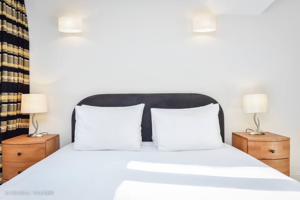 主卧明亮舒适,菱花白色的乳胶漆通刷墙面,让整个空间干净又通透。床头做了黑色的软包设计,提升了业主的居住体验感。床头两侧设计木质床头柜,既增强了主卧的收纳能力,又便于业主摆放台灯等物品。靠墙设计木质衣柜,满足了业主的衣物收纳需求。床头背景墙上设计氛围灯具,橘黄色的灯光温馨又自然。