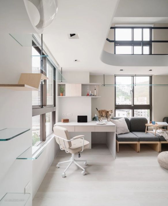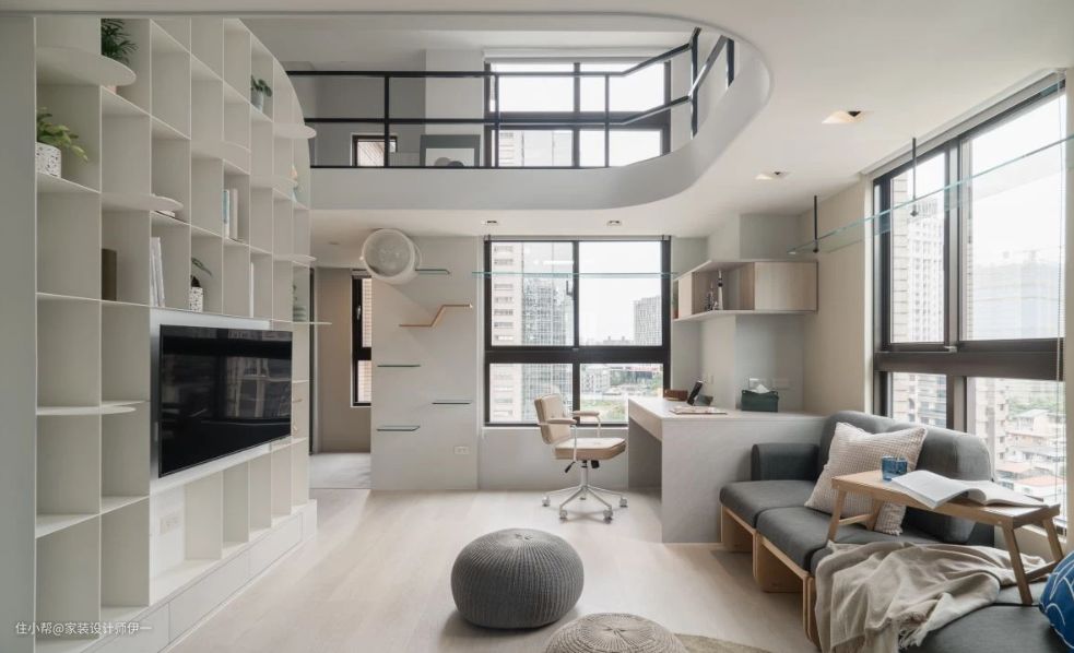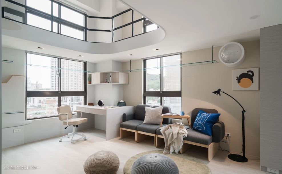 考量屋主工作型态,将办公书桌区安排于窗边,善用畸零空间规划收纳,前后也衔接宠物的猫跳台与太空舱,在办公同时也能享受美景与毛小孩相伴。
