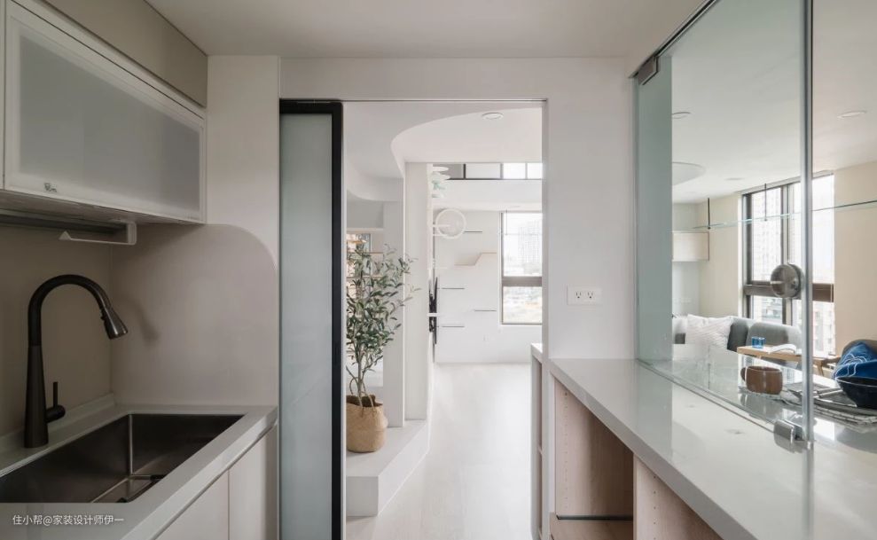 公领域采开放式设计,客厅串联书桌及厨房用餐区,尽可能的放大空间尺度,将原电视墙面转向,使其与楼梯平行,消弭原本狭窄与切割的公领域,视野瞬间宽敞放大,特别订制白色吸睛的客厅电视墙,结合展示、收纳、猫咪穿梭走道等多元机能,穿透视感与后方蓝天的扶手,型塑清爽的居家端景墙。 随着电视墙改向,也同步改造厨房,增设双人吧台台面,营造生活情调,吧台上方的小窗设计能阻隔油烟飘散,美观实用兼备。