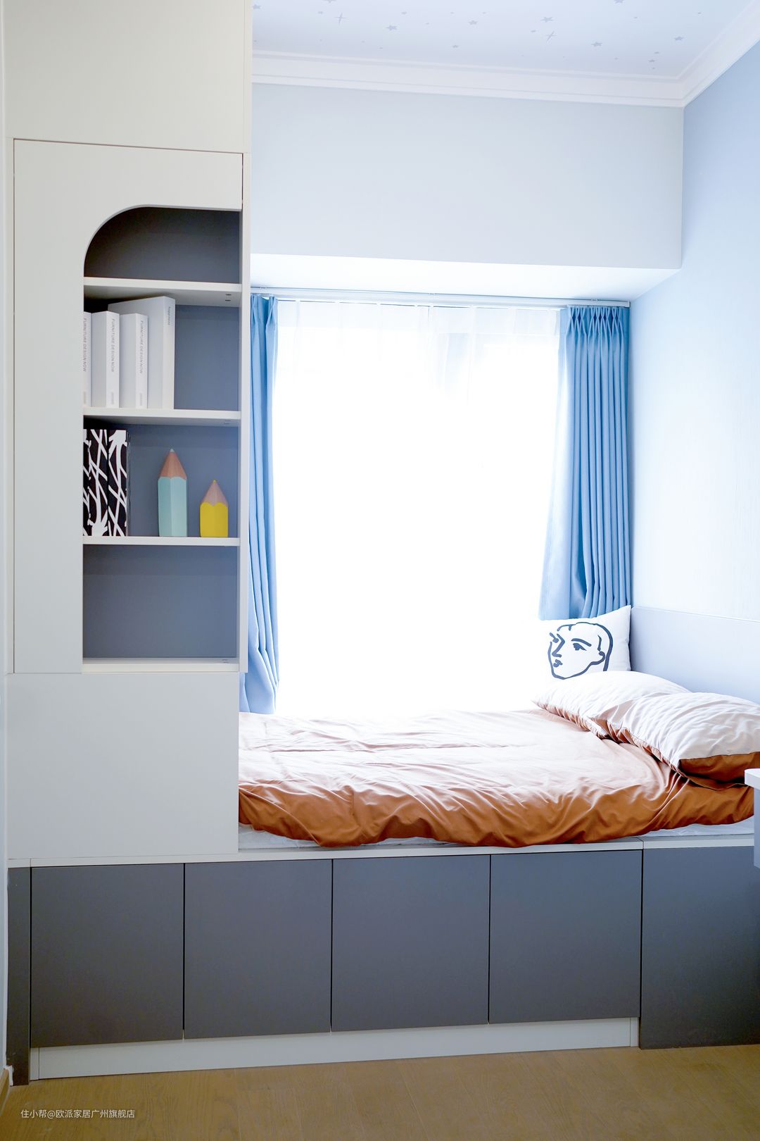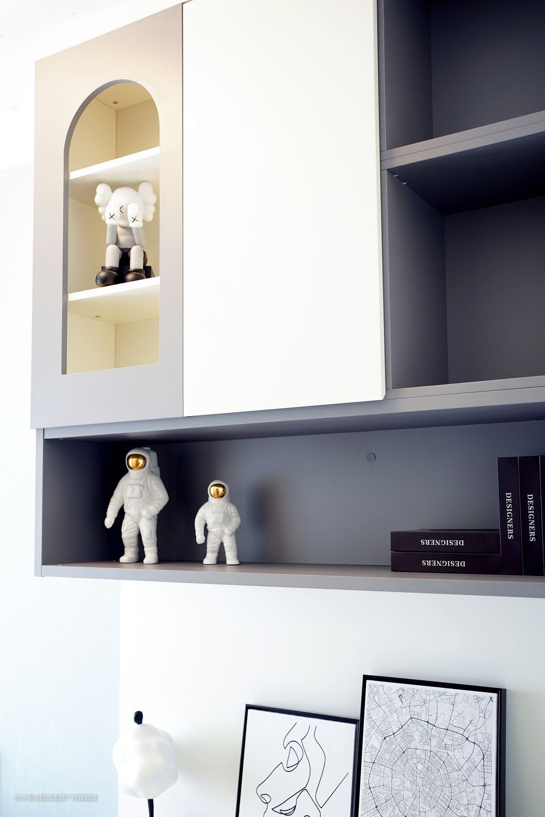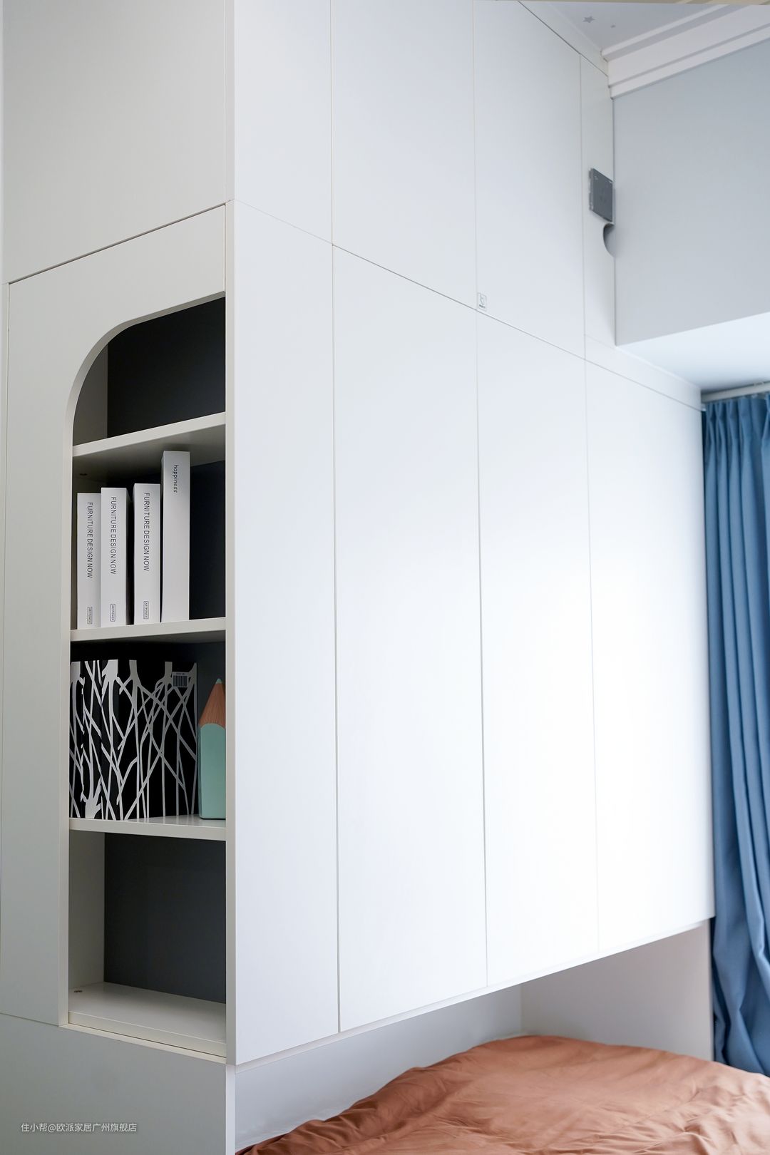 衣柜的实际高度约1.5m,加上床底的储物柜,大大满足了孩子的收纳需求。靠近过道的衣柜处定制了造型开放格,既美化了柜面设计,又方便孩子收纳书籍。