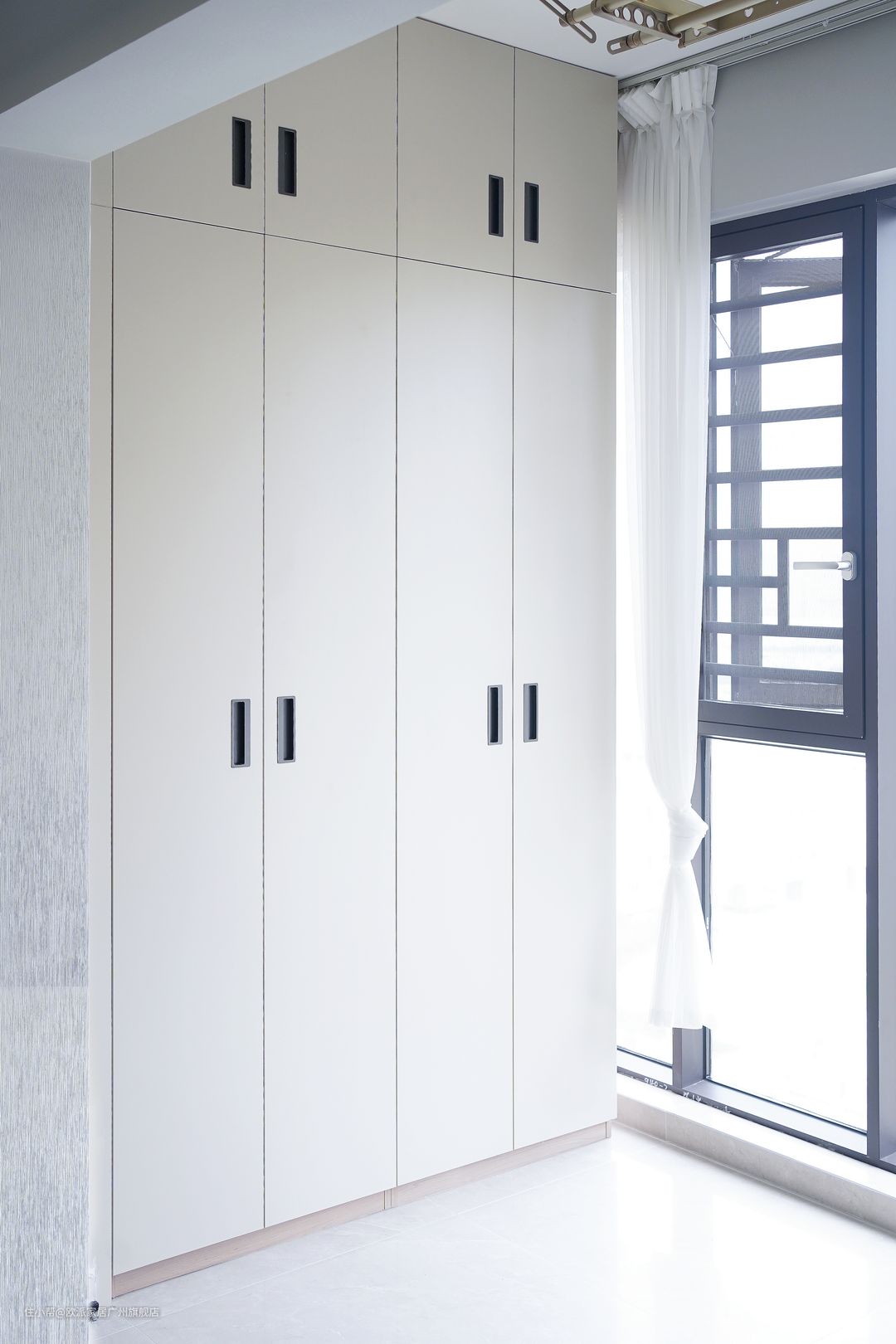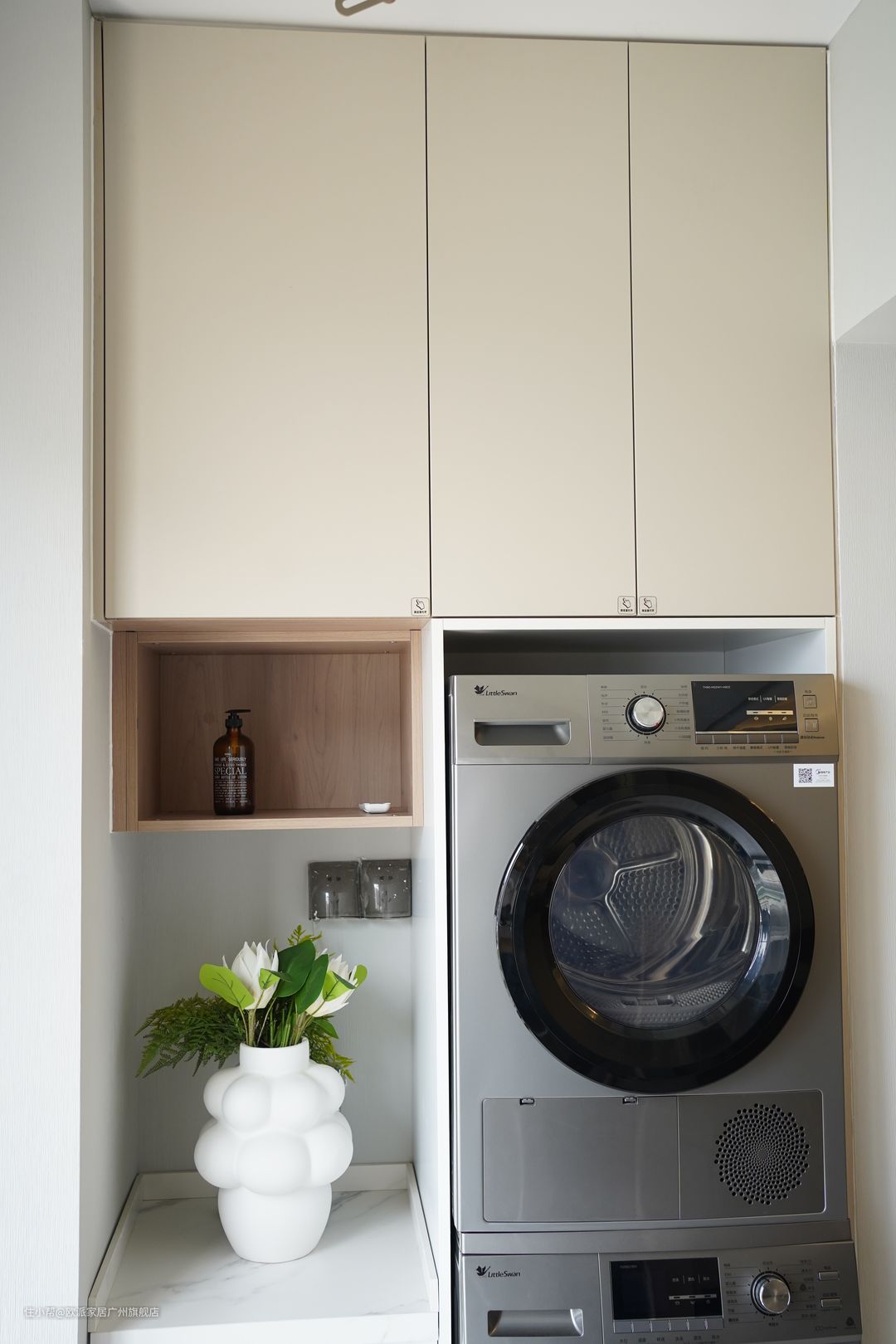 阳台一侧定制了通顶柜,与鞋柜、餐边柜的柜面设计不同,这里的储物柜采用黑色凹型门把手的设计,在同色系的定制衣柜中使用不同组合的柜面设计,打破视觉的单调性。 虽然阳台安装了电动晾衣杆,但考虑到广州有回南天,所以购置了洗烘套装,并在上方的空间定制了米色的吊柜。为了避免拿取洗衣机的衣物时碰到头,吊柜比底柜的宽度减小了15cm。 吊柜的上层用于藏住客厅风管机的线管,避免不美观的线管外露,下层填充了储物需求。整个阳台满足了业主一家的洗衣、晾晒、储物、观景的多种需求,集实用和休闲于一体。