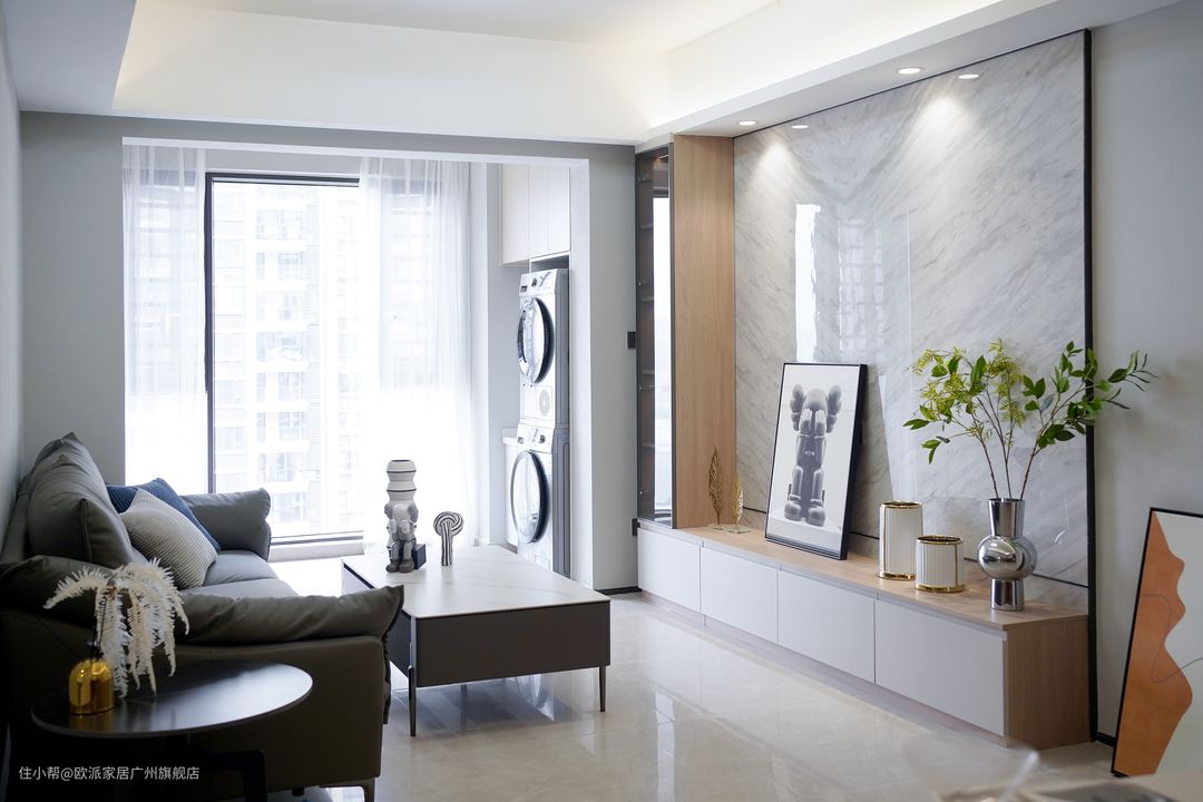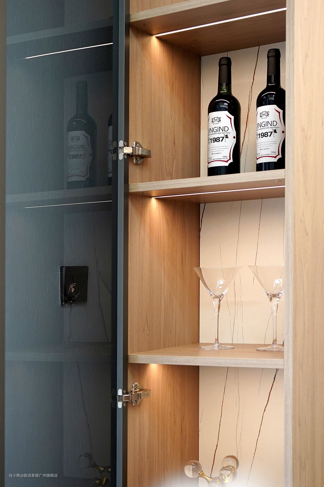 客厅布置了一字型的浅灰色沙发,给过道预留了更多的行走空间,方便孩子们玩耍。过道旁布置了黑色边几,搭配白色岩板方形茶几,便于平时接待客人。 电视机墙安装了整面岩板做背景,搭配内嵌筒灯照射下的“小山丘”射墙效果,形成了整洁简约的墙饰。不仅大气美观,还便于清洁墙面灰尘。白色的落地电视柜中间两格采用推拉门设计,用于收纳电视机和路由器的线管,便于保持柜面的干净。电视柜的落地设计,直接省掉了地面清洁的繁琐。 电视柜上定制了玻璃酒柜,还安装了内嵌灯带,使客厅更加气派。这不仅满足了业主夫妇藏酒的喜好,平时便于招待朋友,还给电视机墙增加了点缀装饰。