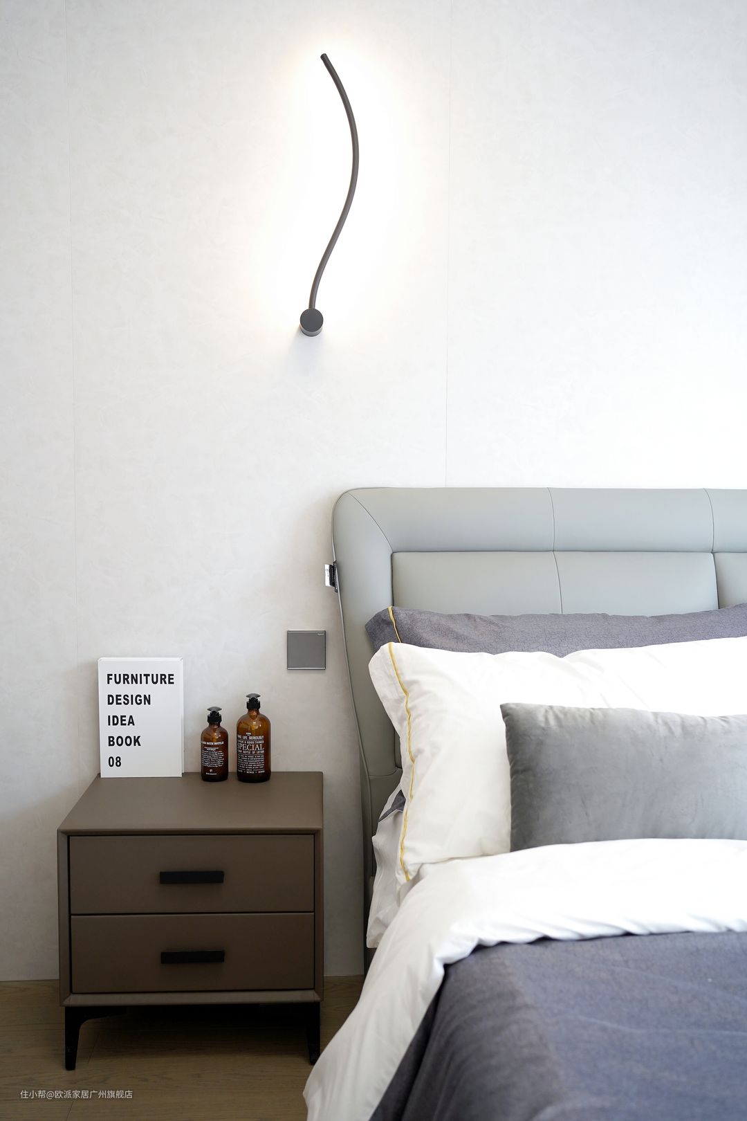 主卧的床头墙用耐用又经济的乳胶漆,采用乳白色+豆沙色的色彩组合,搭配条形壁灯。用性价比较高的方式,不仅丰富了主卧的装饰效果,还给业主夫妇营造了温馨的氛围。 床头靠垫选取了与墙面一样的豆沙色,协调了空间的色彩搭配。地面铺满了木地板,床头柜选取了橡木色,使整个主卧的色彩有深有浅、耐看不单调。