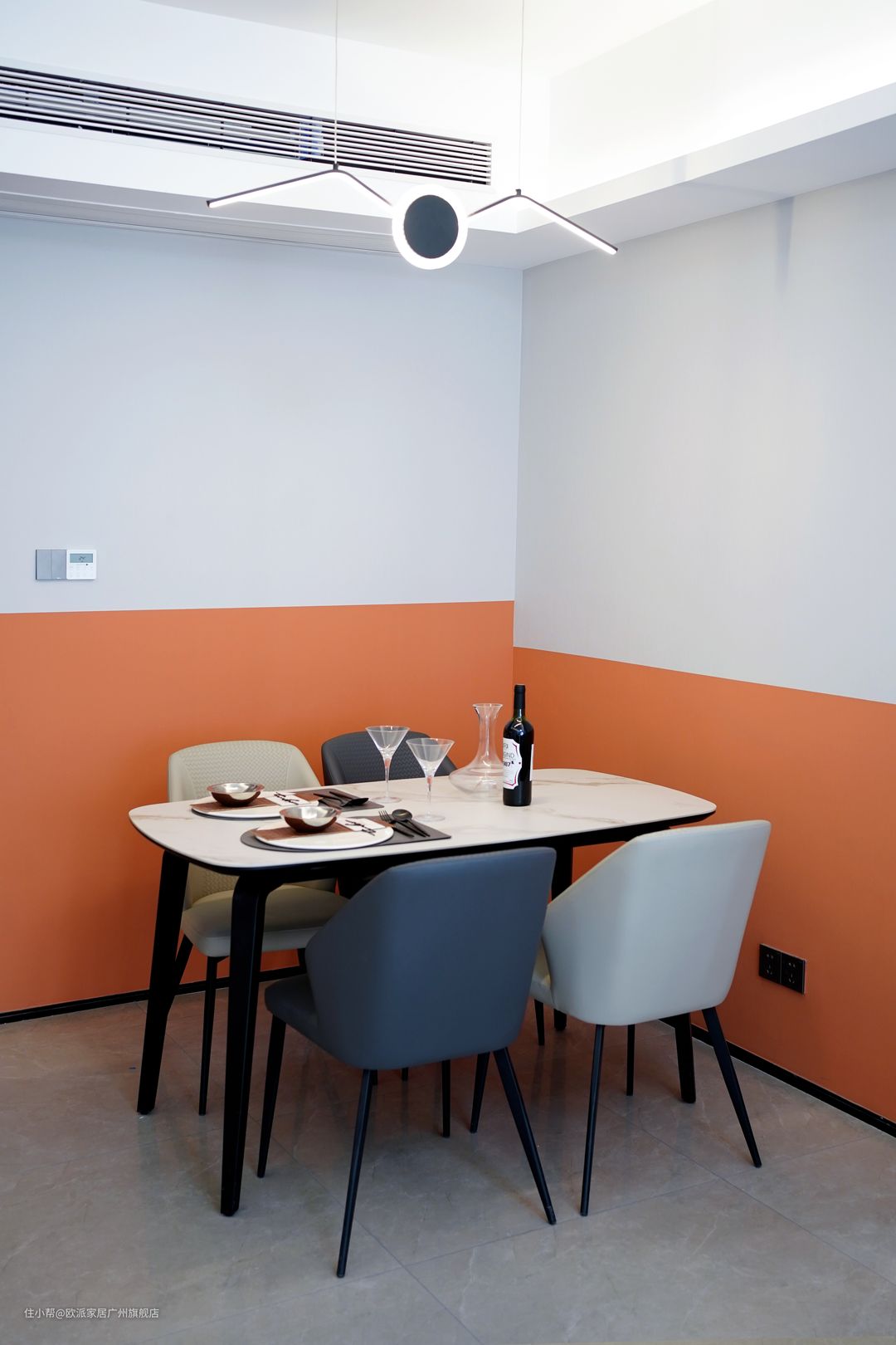 餐厅布置了一张白色岩板方桌,一深一浅的餐椅,简约却不简单的搭配。餐厅的墙面刷了大约1m高的活力橙色乳胶漆,给经典色为主的空间增添一点跳色,增加设计的活力。