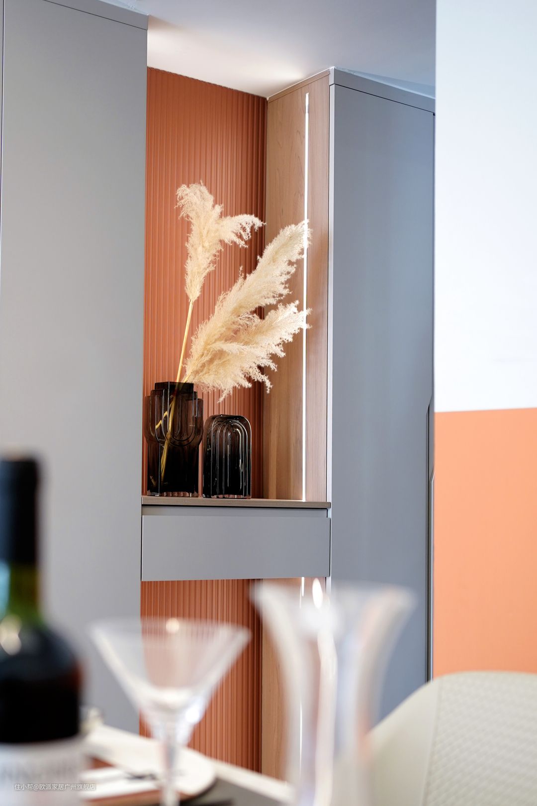 餐边柜布置在餐桌对面的墙边,用橙色护墙板隔断玄关和餐厅两个空间,保持空间的独立。 餐边柜的柜面采用口字型的对称设计,镂空处以岩板为背板装饰,简约又整洁。与旁边的鞋柜采用一样的色彩搭配,白色柜面+蜂窝板背板+原木色层板,使相邻的定制家具达到了协调统一的视觉效果。