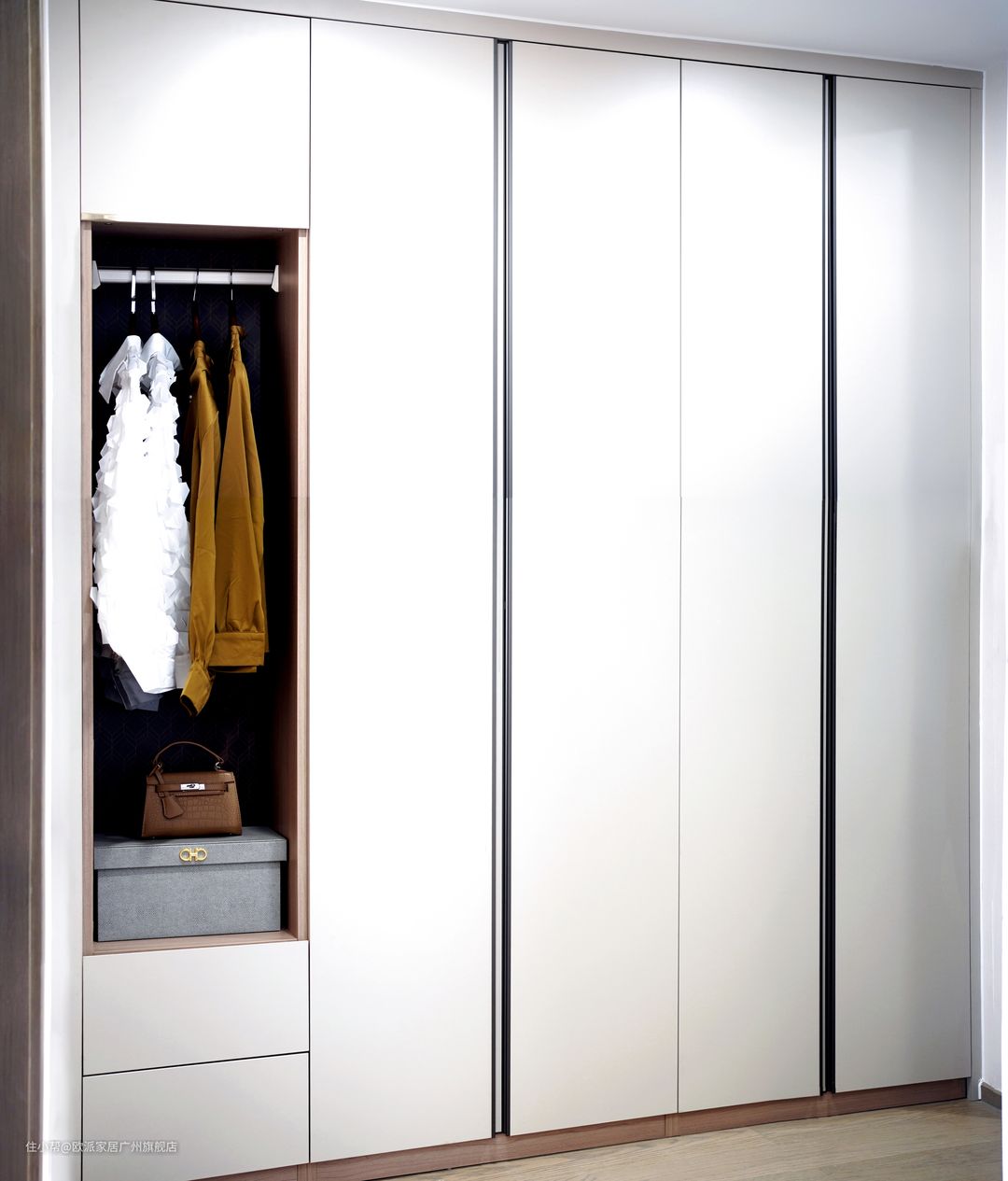 次卧的衣柜分为上下层,上层收纳床上用品,下层以挂衣区为主,搭配几层可以随意调节高度的叠衣区。黑色的单边门把手,简约又方便。 衣柜最里面处留空,延伸出与床齐高的抽屉式床头柜,不仅避免了开柜门时障碍,还能用两个家具的一体化保持空间的协调统一。