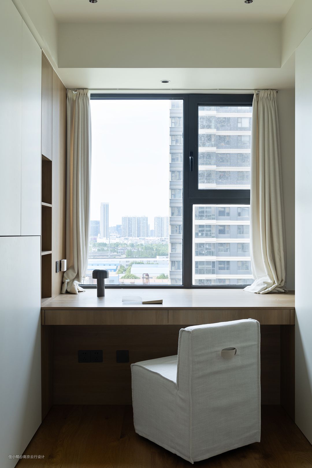 床头小桌连接衣柜,顺应家的极简装饰和木白的宁静,空间亦能带给人沉思和充实的精神内核。抚触材质每一寸木纹肌理,从指尖流入心底细腻的温润,传递生活的治愈与惬意。