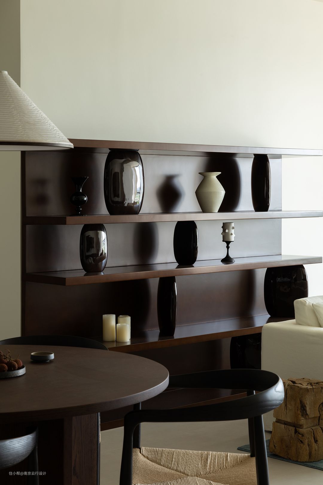 优越的地理位置,让屋主在家就能享受到户外湖水的碧蓝。客厅空间的尺度相对较大,我们并没有对于硬装上做过多的修饰,也只是通过软装来表达空间舒适感。 湖蓝的地毯与窗外景色对话,两处空间产生视觉的关联和互动,仿佛泛于湖面之上,享清风徐来。居于一角的意式蘑菇灯,经过边缘化的处理,为空间带来轻盈的表达。 贴墙书架的褐色在净白的居室中添上浓墨重彩的一笔,极简的家里需要一抹重色去平衡轻重缓急,现代和古典的结合在书架展示柜上体现,顺应居室的整体审美趋势。