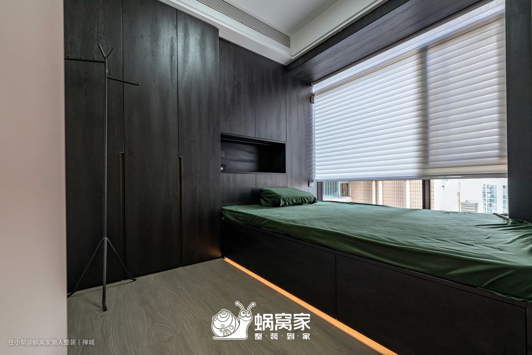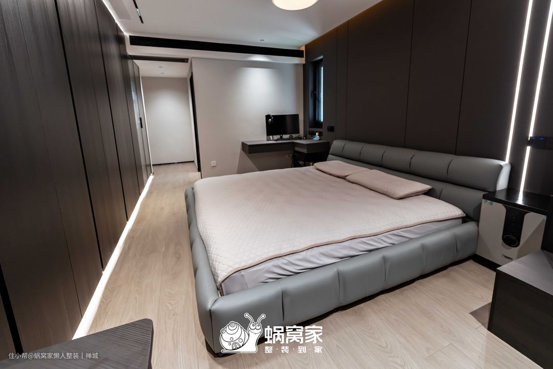 次卧主要作为业主待客和父母偶尔居住的复合式空间,在整体设计上,以从简为主,沿用整体的调性,保留床柜一体设计,不占空间,又不影响日常使用。