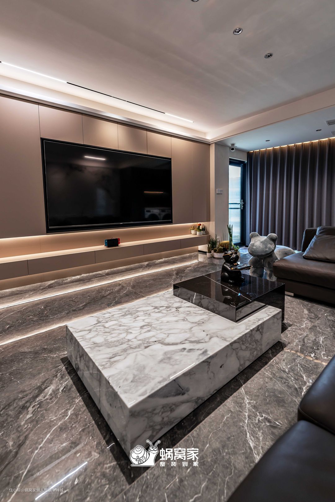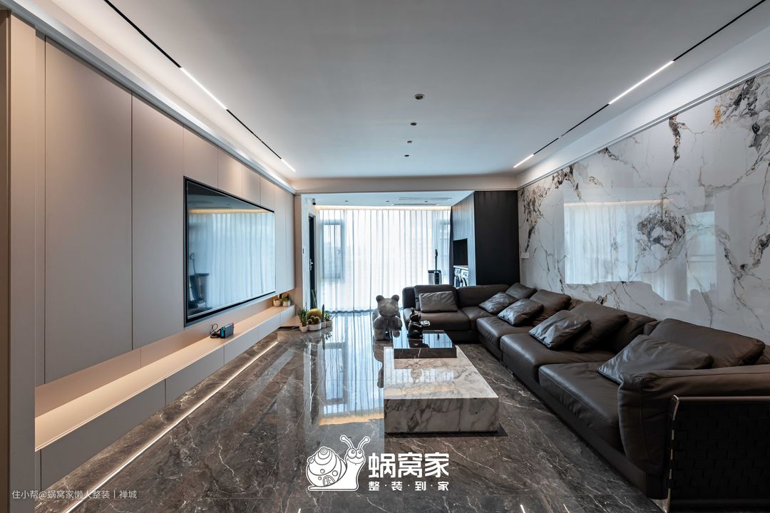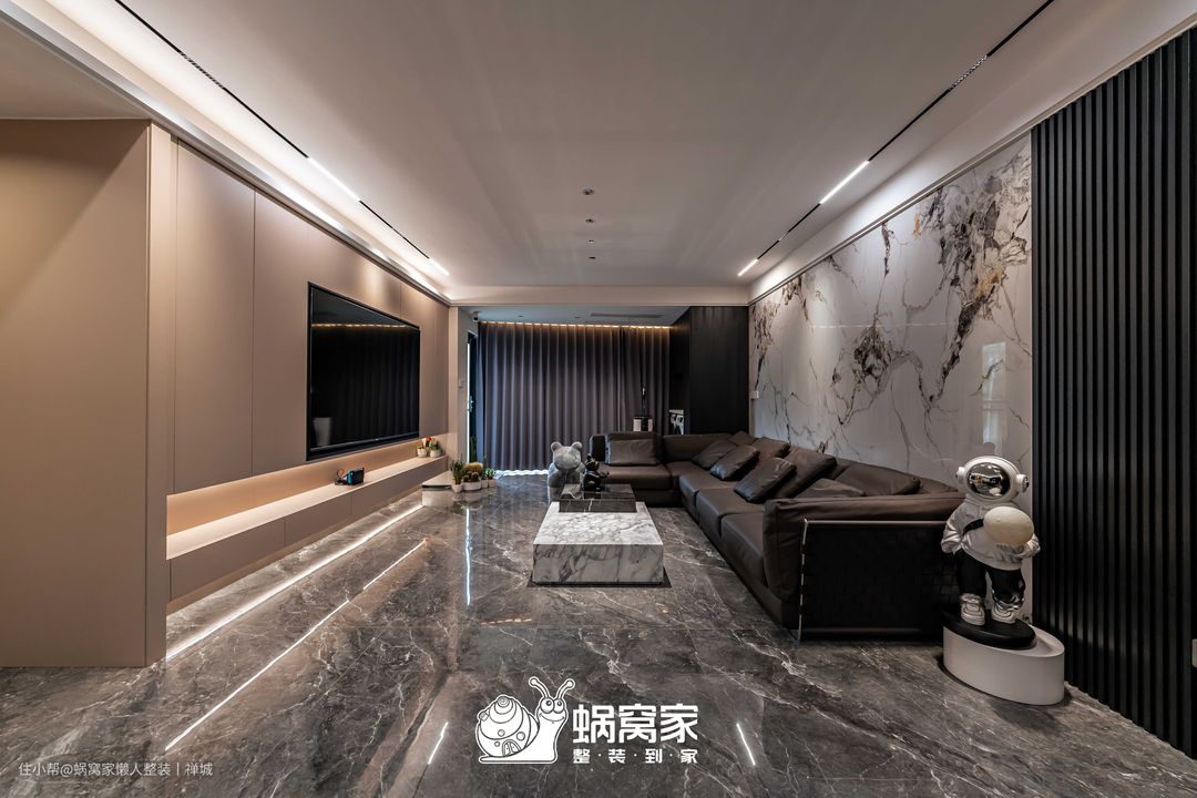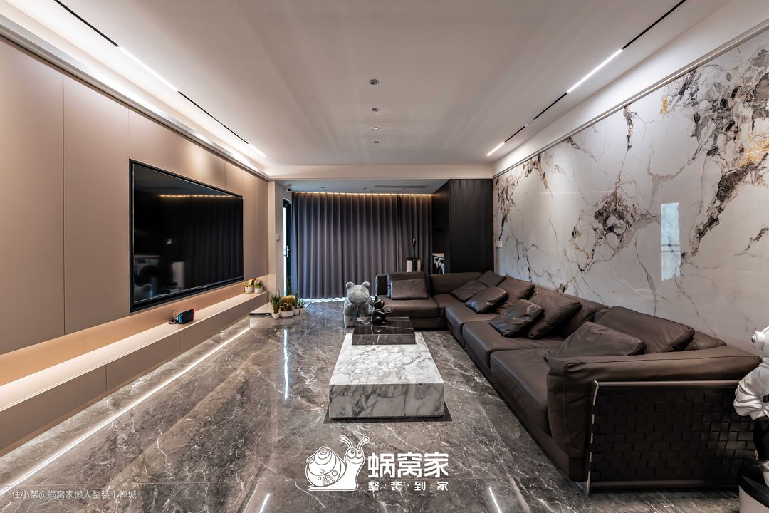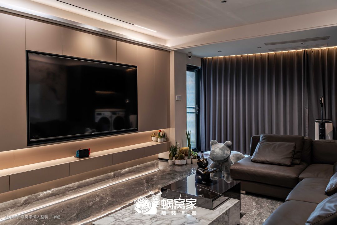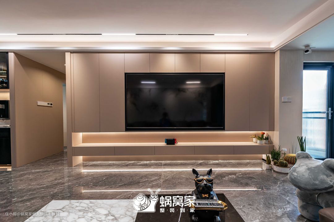 电视背景墙为悬浮式定制柜设计,减少地面接触,方便日常清洁,但不会因此缩减了存储空间,杂物放置、隐藏插座与电视都不在话下,同时柜体间嵌入灯带,营造悬浮视觉,削弱柜体的笨重感和压抑性。