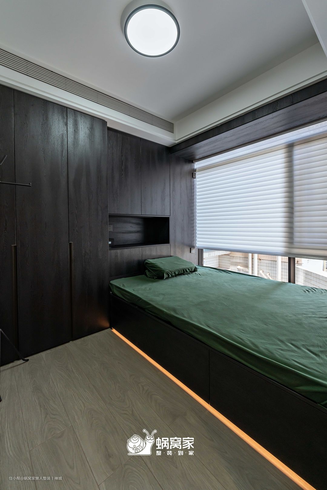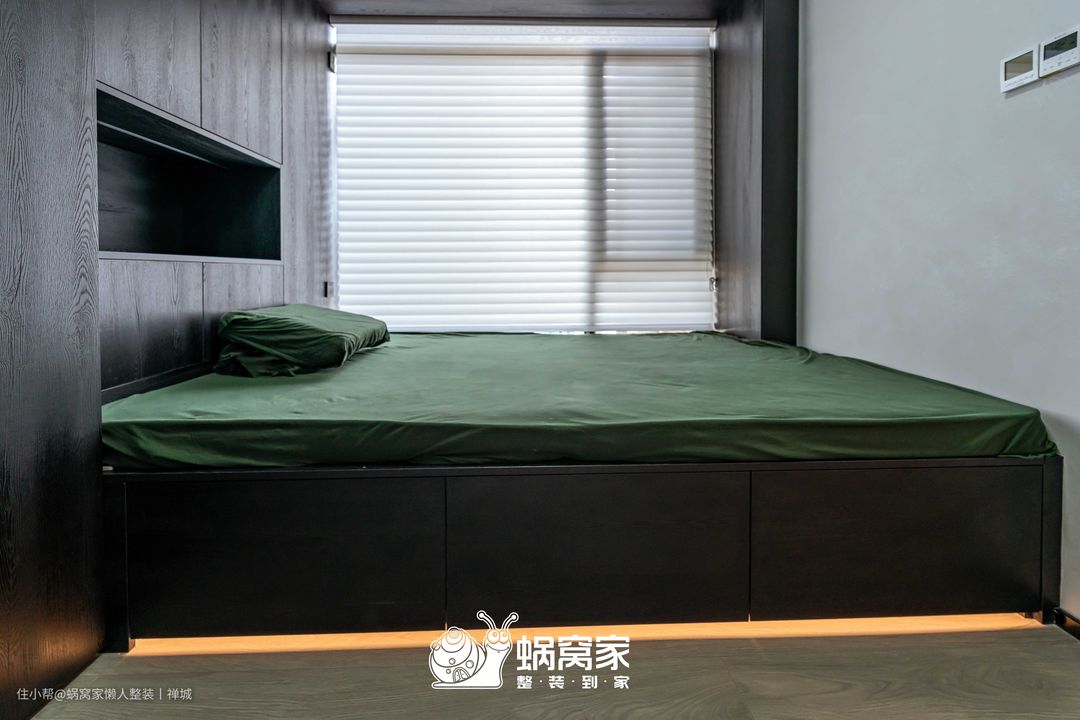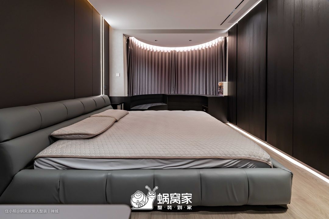 次卧为无主灯设计,用筒灯和床底线灯做辅助,在夜间提供柔和而不刺眼的照明,方便起居者起夜,减少磕碰问题。