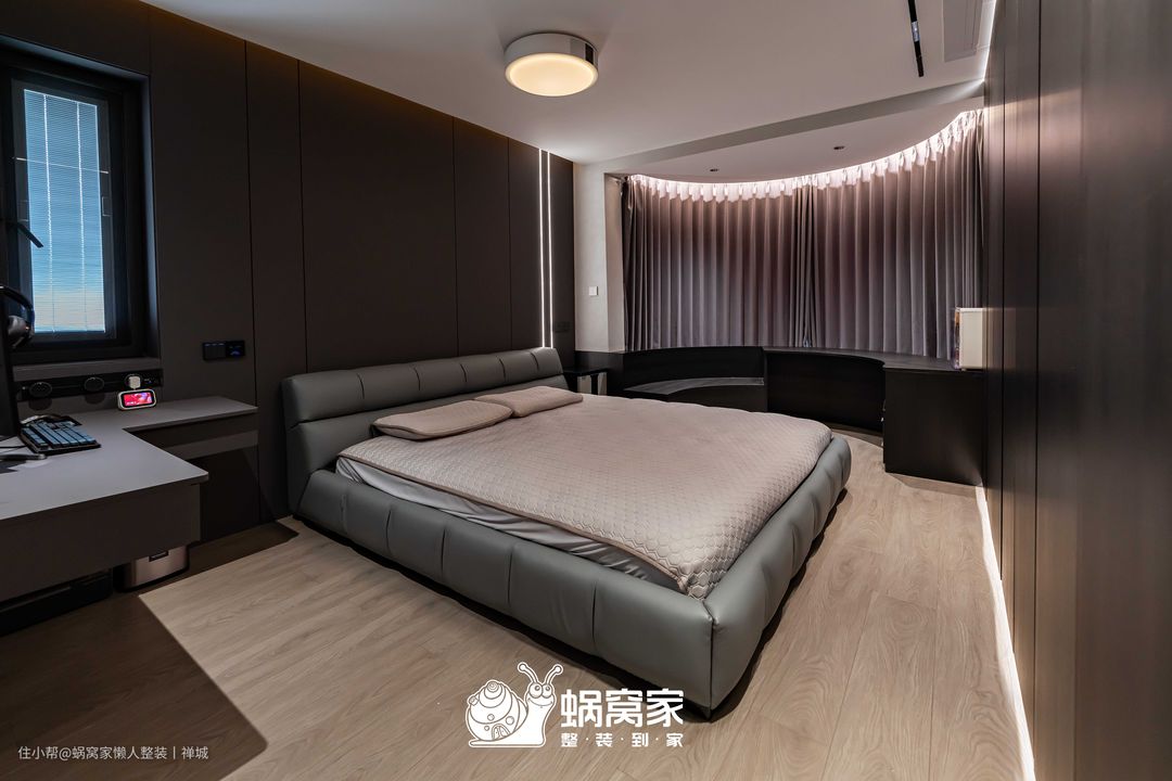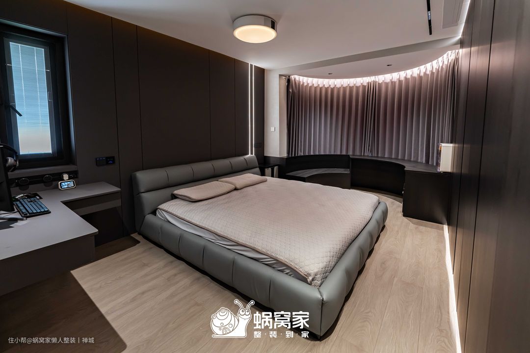 摒弃原有的顶柜设计,改成L型床头桌,平日充当床头柜,放置随身物品,业主忙碌时关上门,就形成私人办公区,并且为悬浮式设计,节省空间,减少清洁死角,视觉上更加轻盈。主卧的阳台为弧形空间,业主不希望仅作为观赏区,可以增加功能属性,我们沿床定制实木桌椅,让女业主在梳妆打扮之余,还能360°无阻碍欣赏美景。