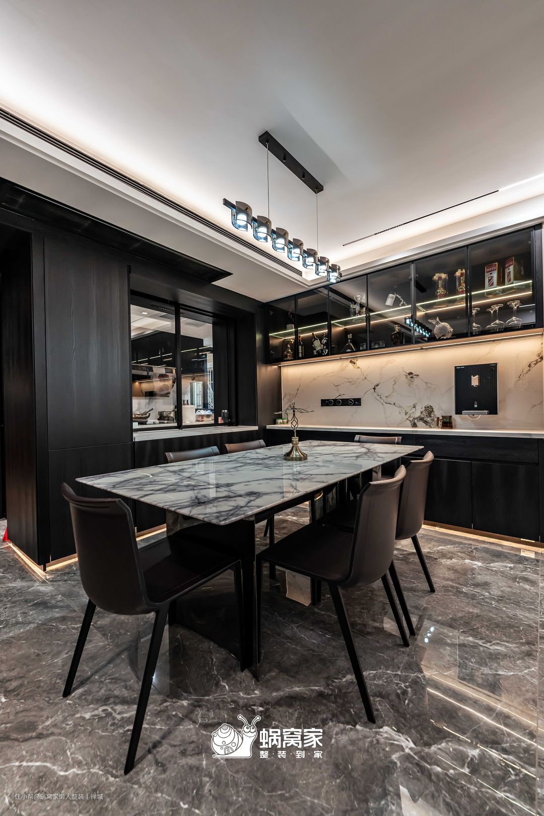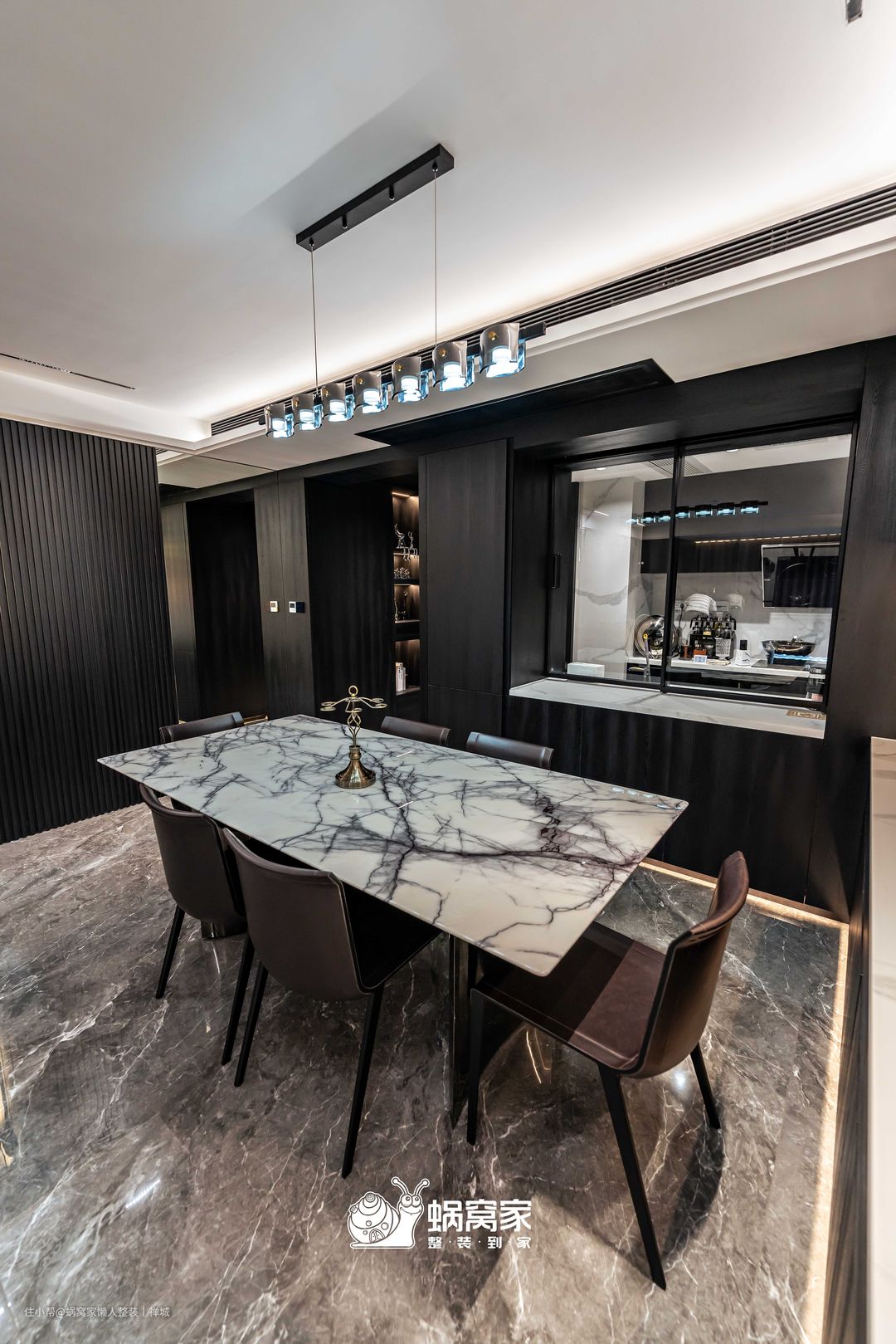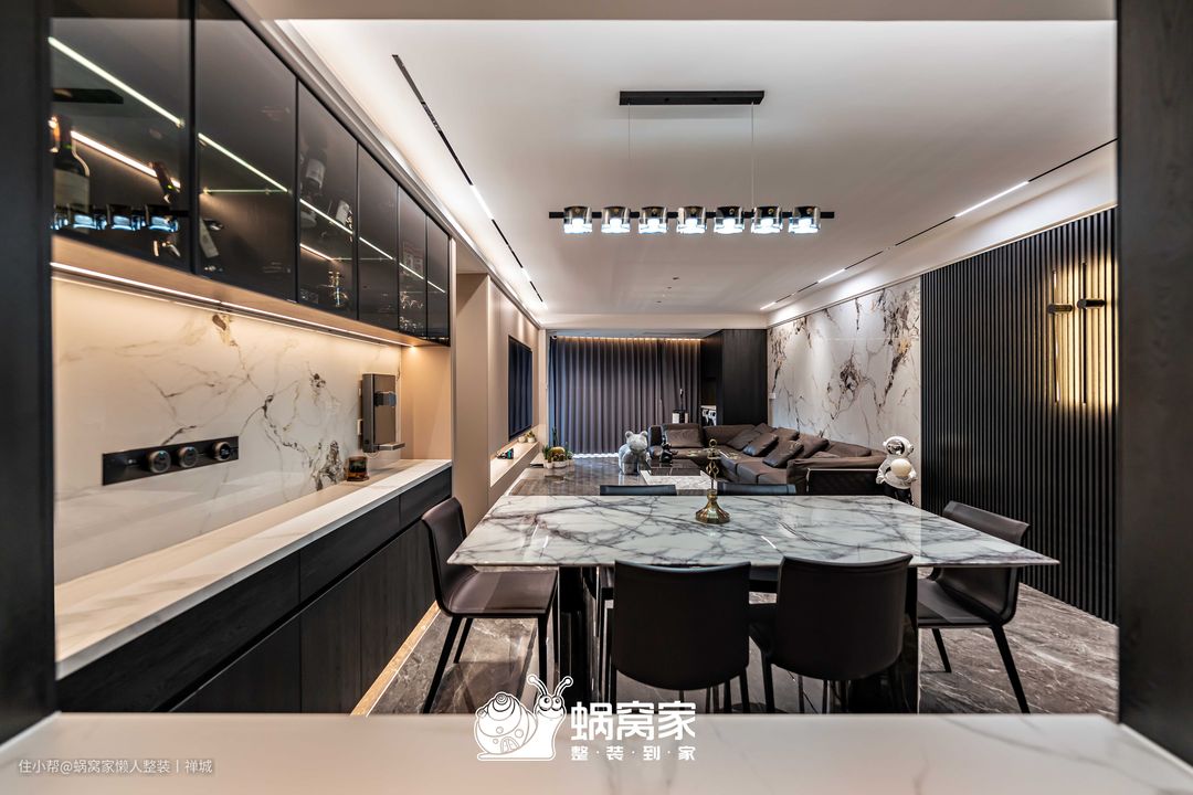 为了避免视觉疲劳,餐椅选用棕色系作为空间调和剂,精挑细选的金属吊灯为就餐空间增添艺术氛围,搭配岩板餐桌,用简单纯粹的色调,提升空间格调。