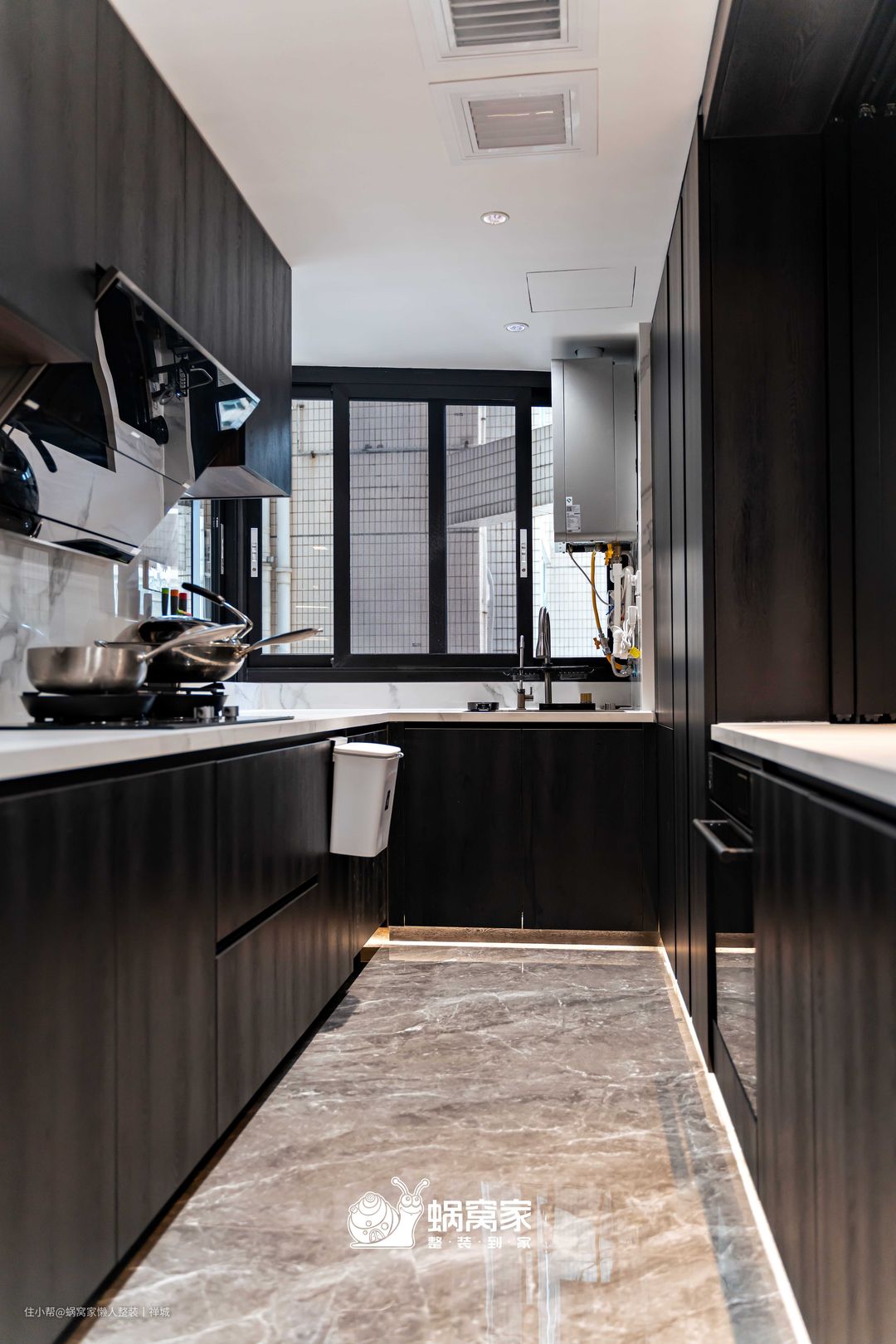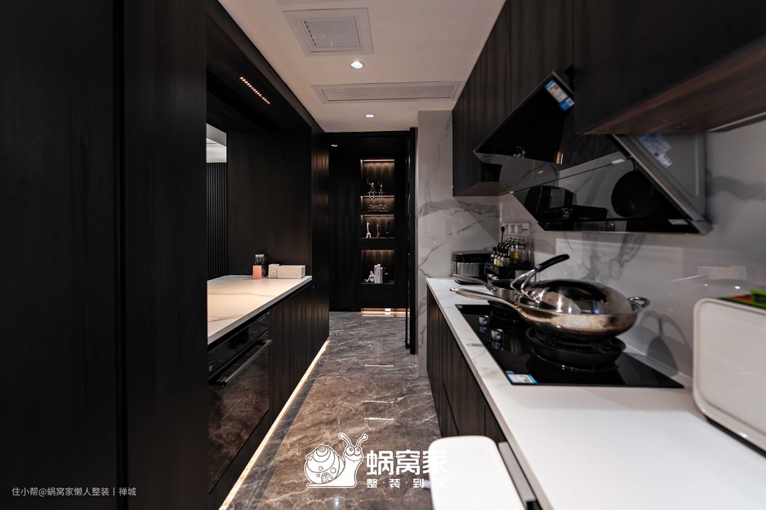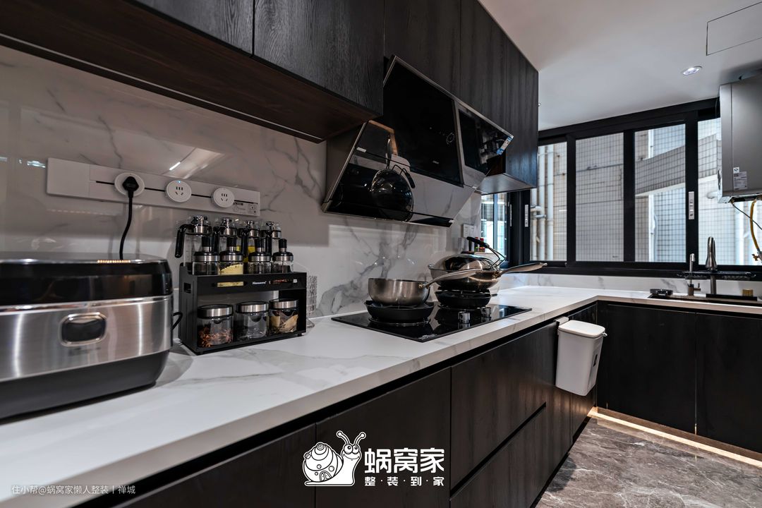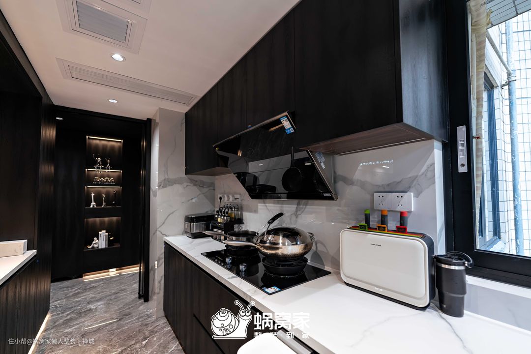 延续了黑白灰色系设计的厨房空间不仅耐脏,而且在视觉上更显低奢大气,将空间的质感贯彻其中。考虑到厨房的采光欠佳,我们在厨房与餐厅之间设计了一扇推拉窗,不仅增加了厨房的光源,还提升了餐厨空间的互动,让业主在做饭之余,能通过室内窗关注孩子的动态。
