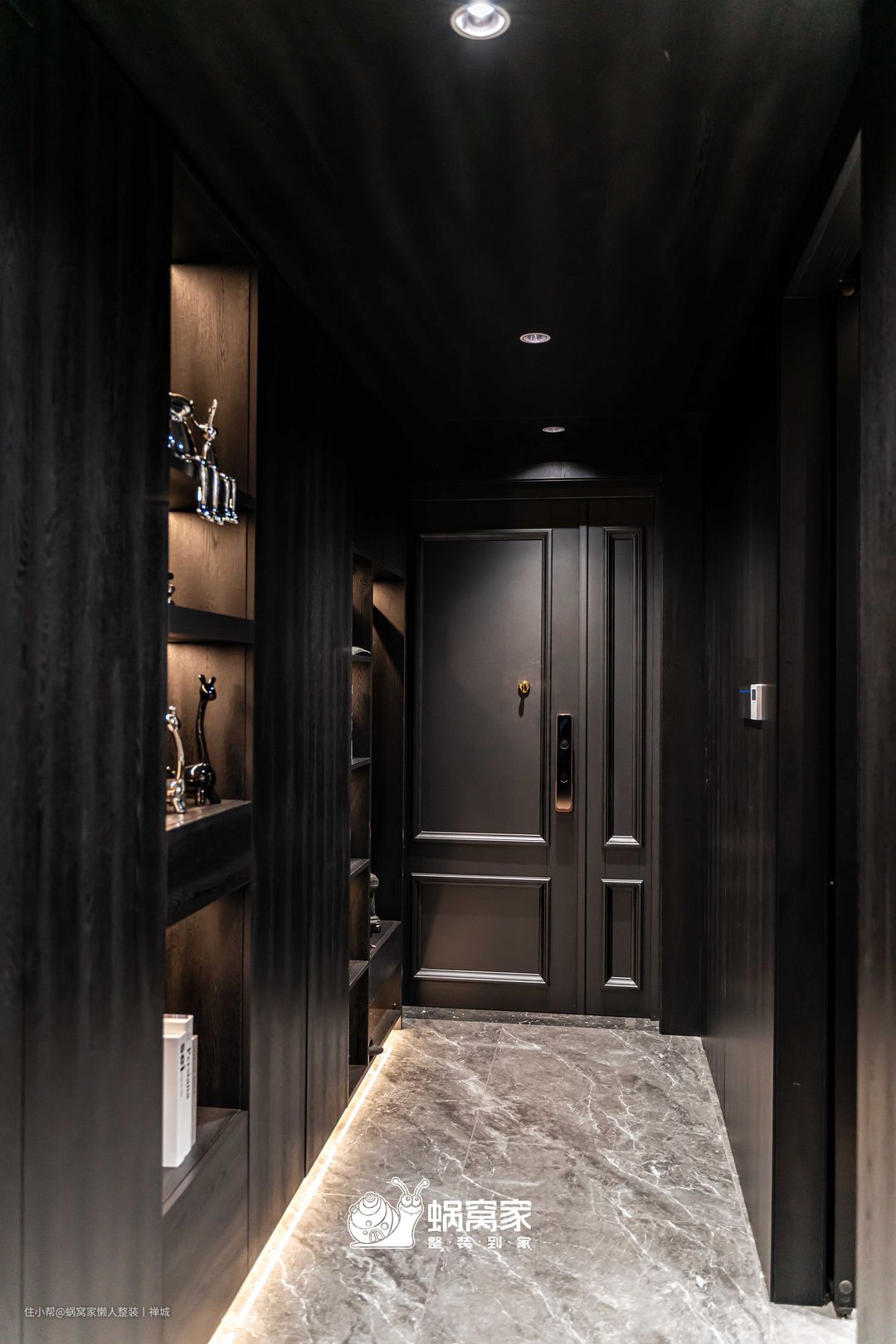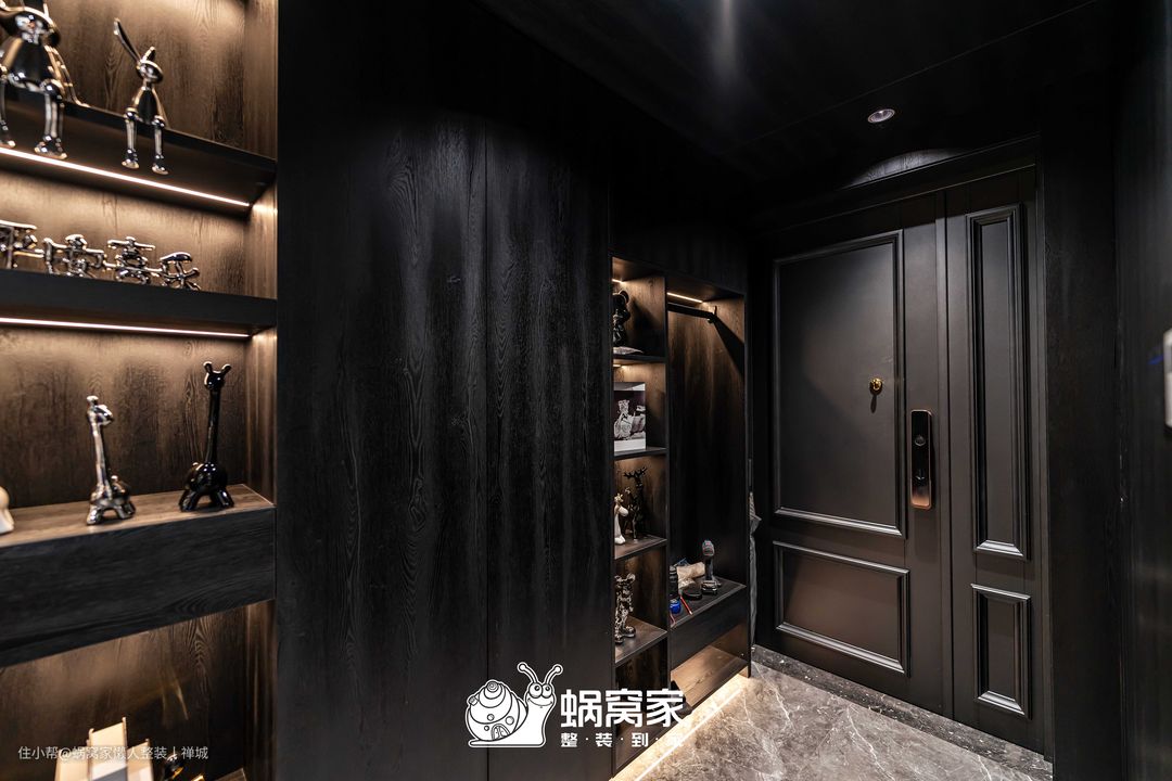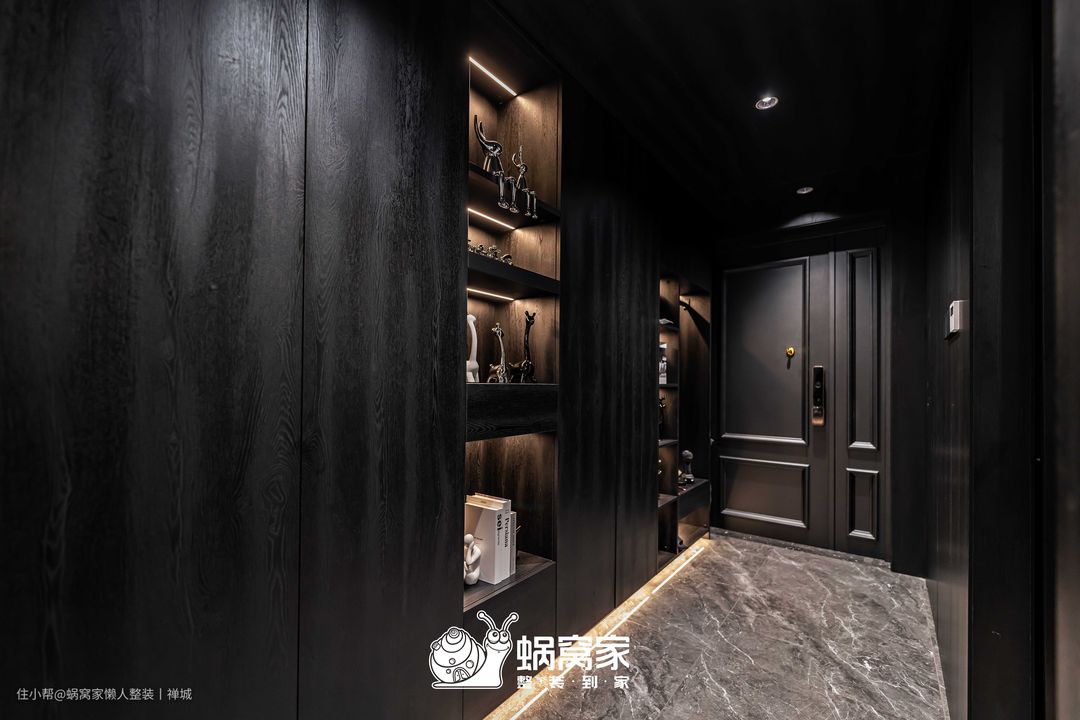 本案在玄关处以黑色和灰色碰撞向内延伸,从门饰的纹理感到平滑的木饰面的平面造型,中间穿插开放格用灯具做内嵌,细节处都是高级感。