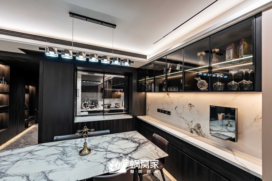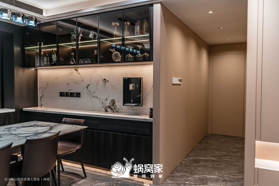 靠墙定制了餐边柜,但未像常规一样定制到顶设计,上面留空的部分可以摆放装饰品或绿植,提升空间美观性,而在视觉上不会那么压抑。餐边柜的酒格业主原定想做开放式,但考虑到孩子的安全性,增加玻璃柜门,安全性得到保障,也提到划分空间的作用,让业主使用更方便,加上灯带设计,视觉效果满分。