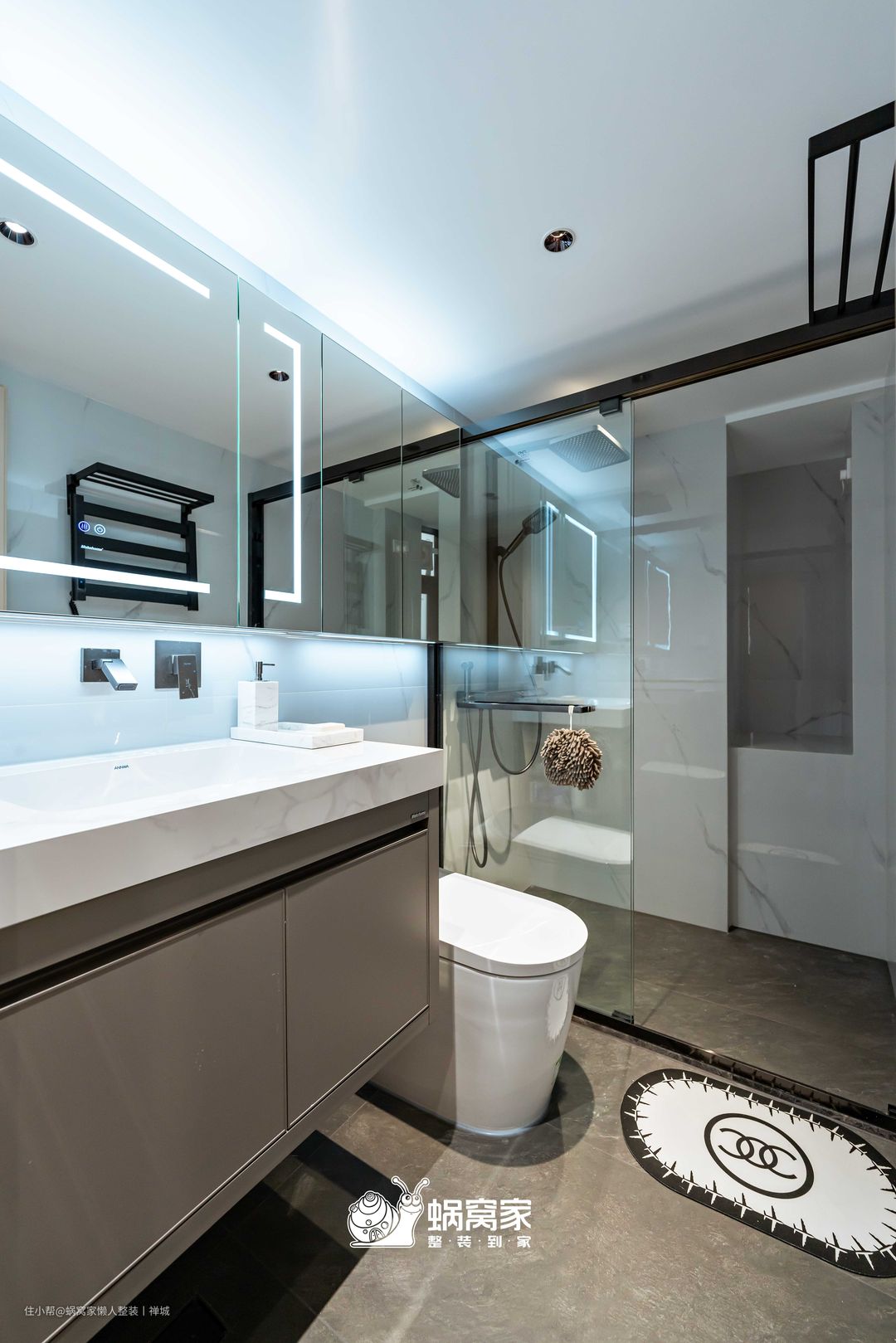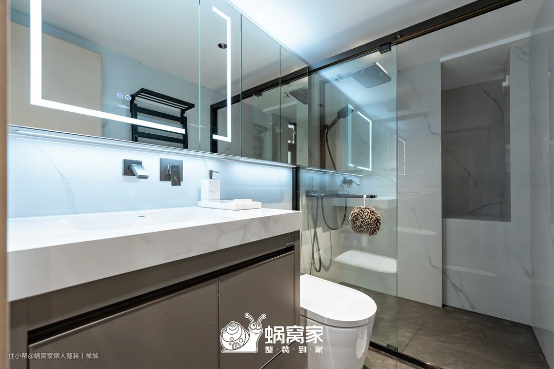 卫生间沿着墙面做镜柜且安装感应灯带,白天女业主化妆的时候就可以打开灯带,更加清晰看清脸部轮廓,更好的梳妆打扮,为生活增加精致的仪式感,而夜间有人经过时,感应灯会打开,不用担心孩子摸黑去卫生间啦。