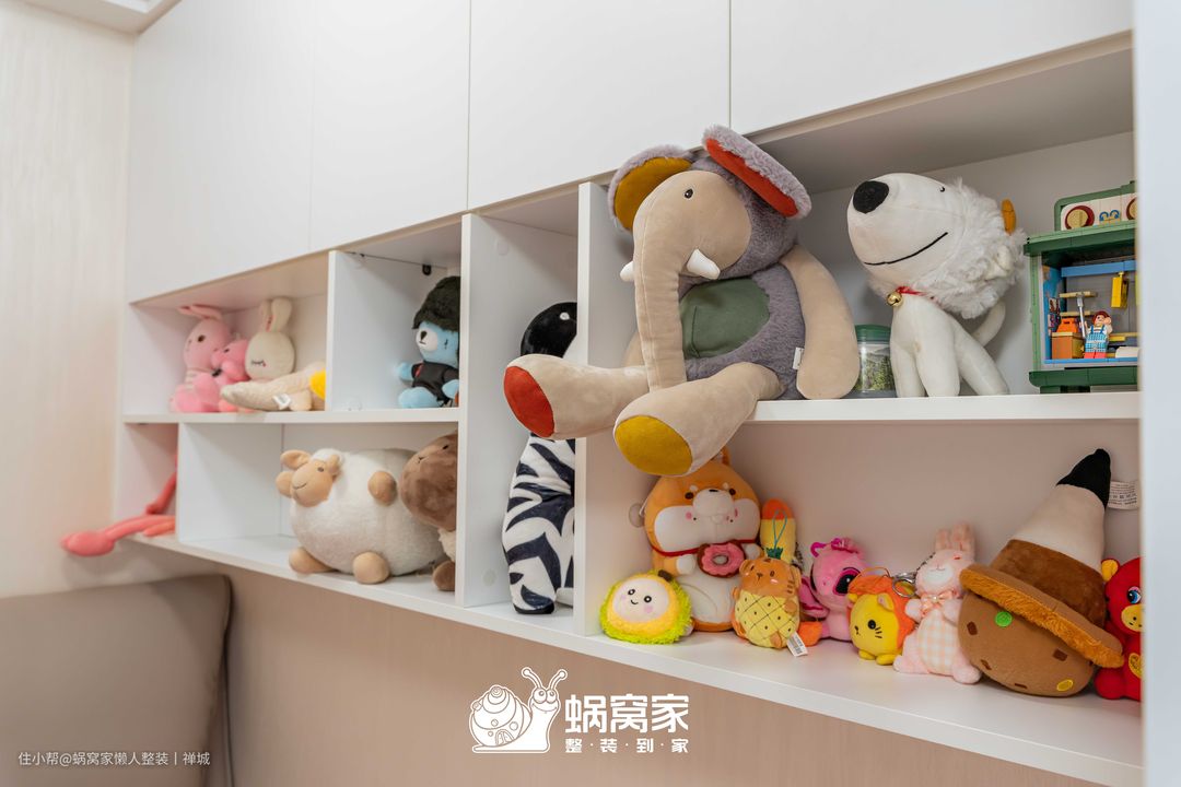 床侧边柜子主要作为孩子的玩具和过季衣被收纳空间,即方便孩子随拿随放,养成即可收纳的好习惯,又能减少衣柜的开合而弄脏衣被,与此同时,柜体隐藏式无把手设计,视觉更加简洁美观。