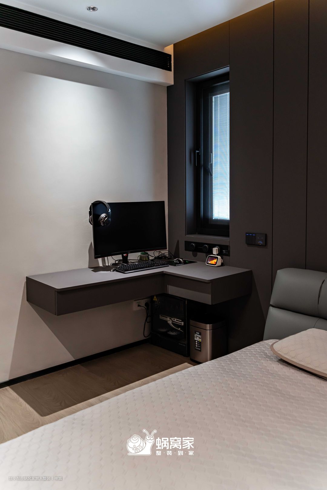 主卧没有多余的装饰造型,更多的是想营造舒适感,能有一个放松的空间,因此在全屋做智能化的基础上,给主卧配备了“小管家”,业主进出卧室,灯具、空调自动开关,尤其睡眠的时间,可以直接通过语音启动“小管家”,实现躺平生活。