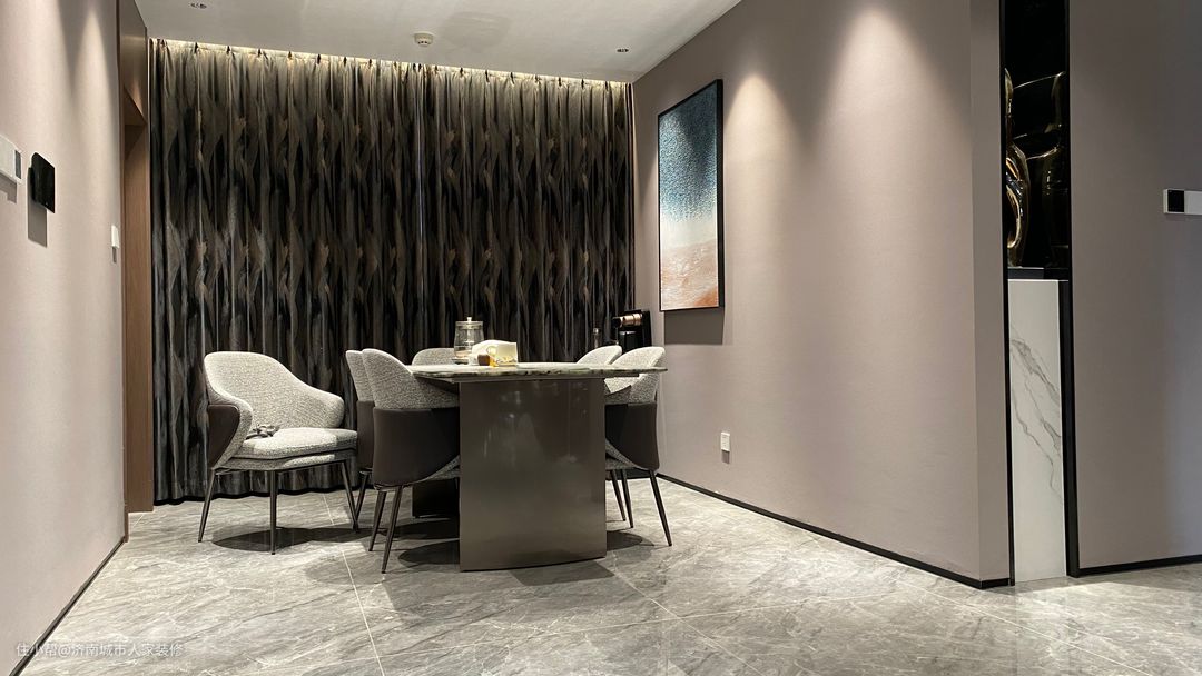 餐厅以简洁大气为主,大理石面板的餐桌与灰色地板空间相对应,衬托出了意式大气格调。采用了无主灯的设计,暖色调的射灯让餐厅氛围更加轻松。