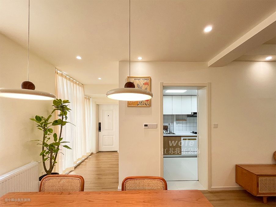 解决客厅采光问题: 1、将客餐厅打通,将次卧靠客厅的一面墙增加一个窗洞。将三个空间连通起来,南北通透,光线充足,通风性好。 2、增加辅助光源,除了客厅主灯和餐厅吊灯之外,在吊顶上增加射灯,让房间亮起来。 3、通铺浅木色木地板,这种色调对采光不挑剔,和各种家居风格都能完美搭配。