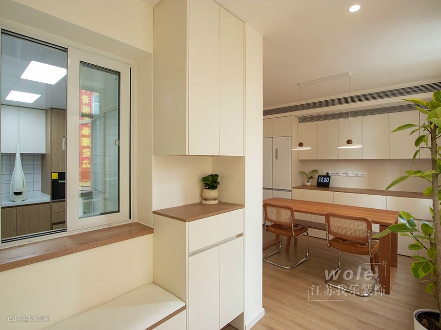 玄关做了高中低落差设计,高柜到顶,中间镂空,摆放绿植与杂物。半高处正好与阳台窗户齐平,不阻碍厨房的光线。低处做换鞋凳,底部留空好放鞋。整个空间,层次分明不凌乱,奶白色的柜体干净素雅。