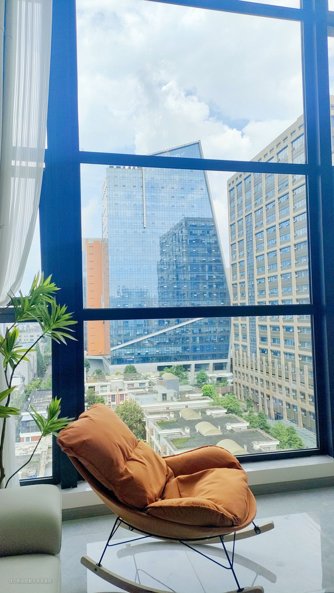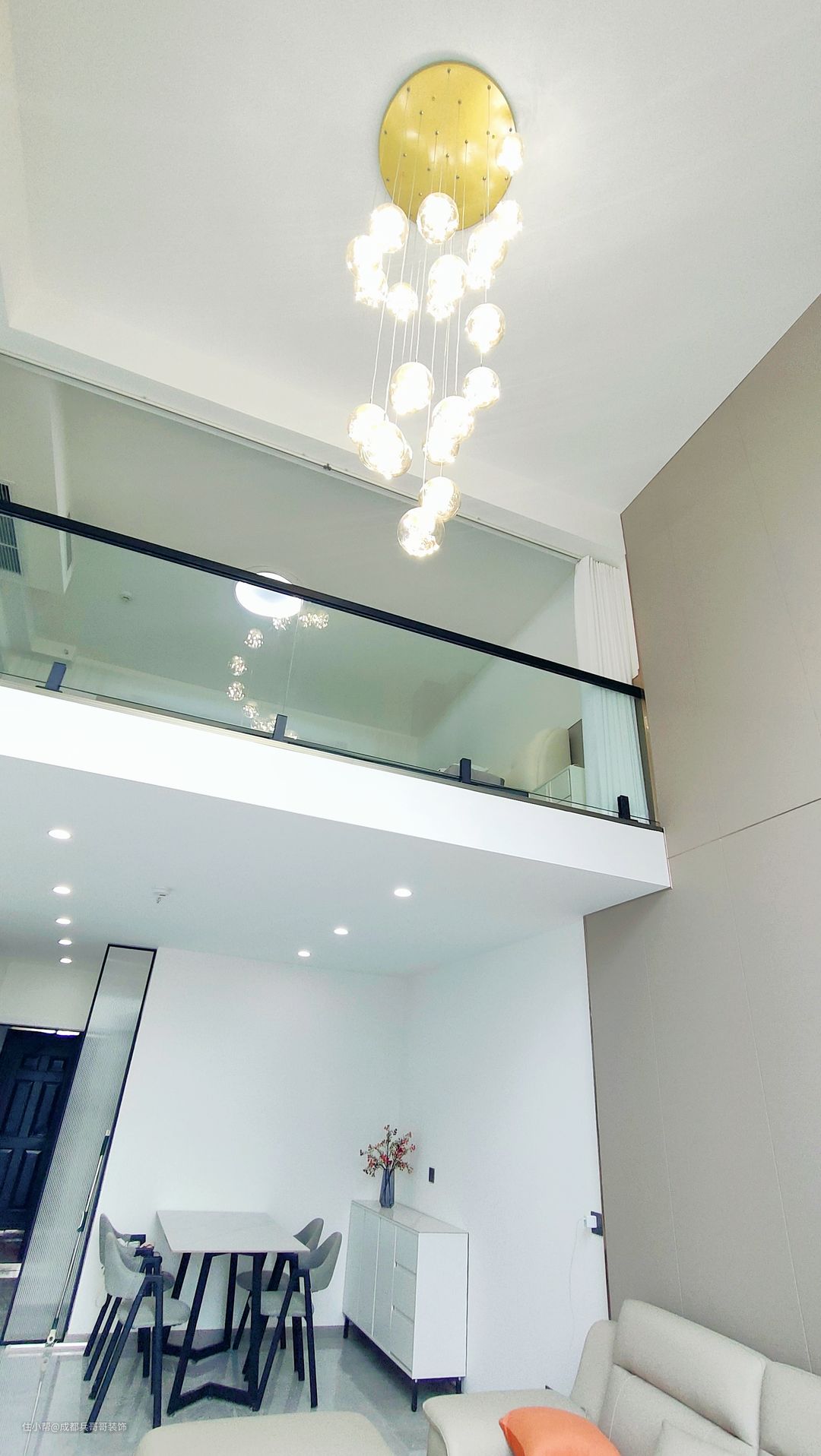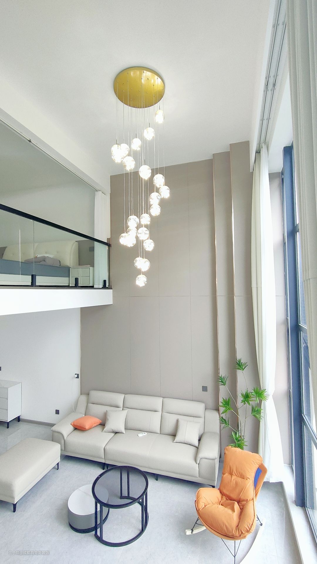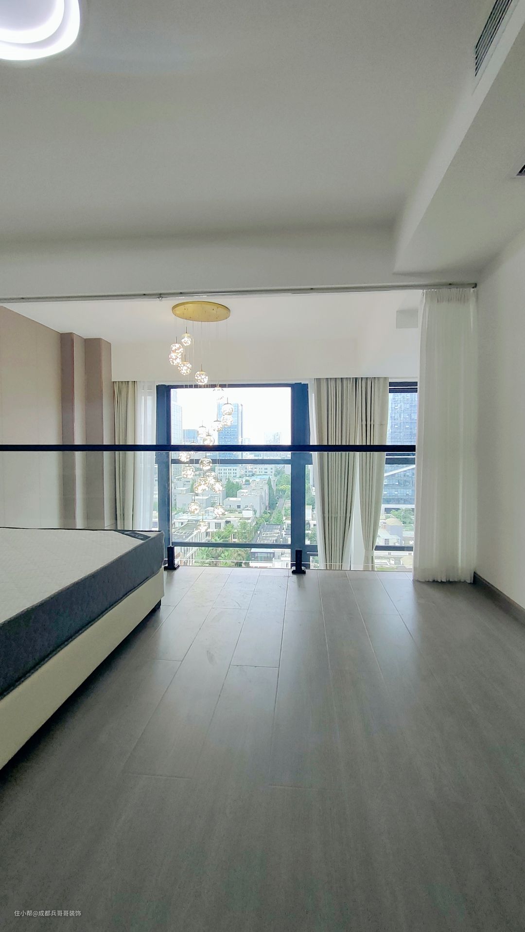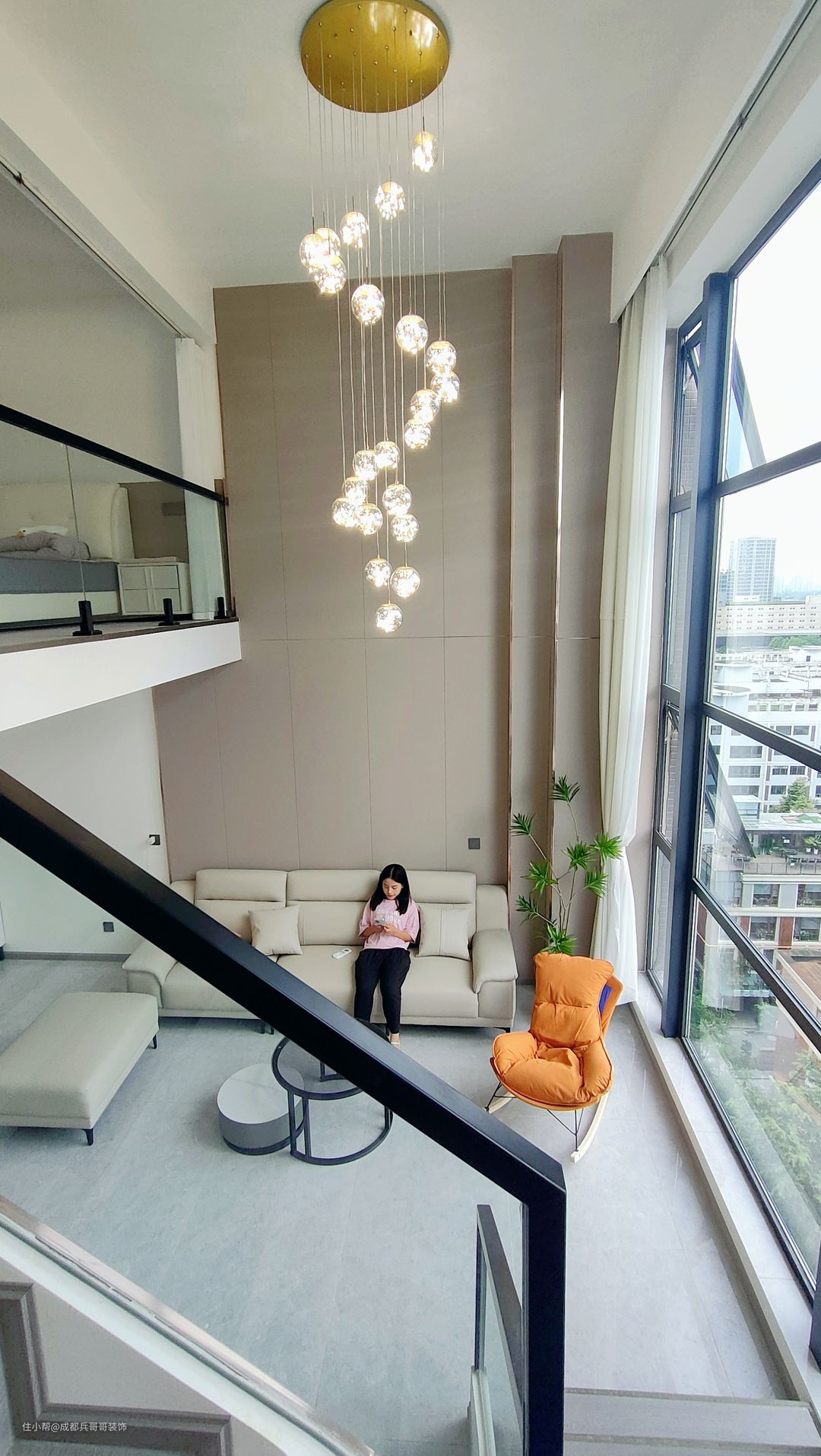经过设计,公寓拥有5米多的挑空区域,保留全景窗户,12楼看窗外的城市景色别有一番风味呢~ 屋主自己选购的吊灯,很有品位,与整体风格也很搭,营造出浪漫、温馨的氛围感……