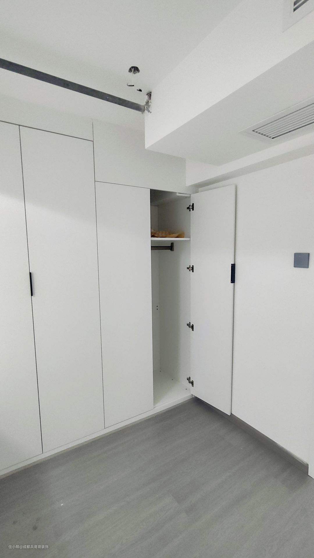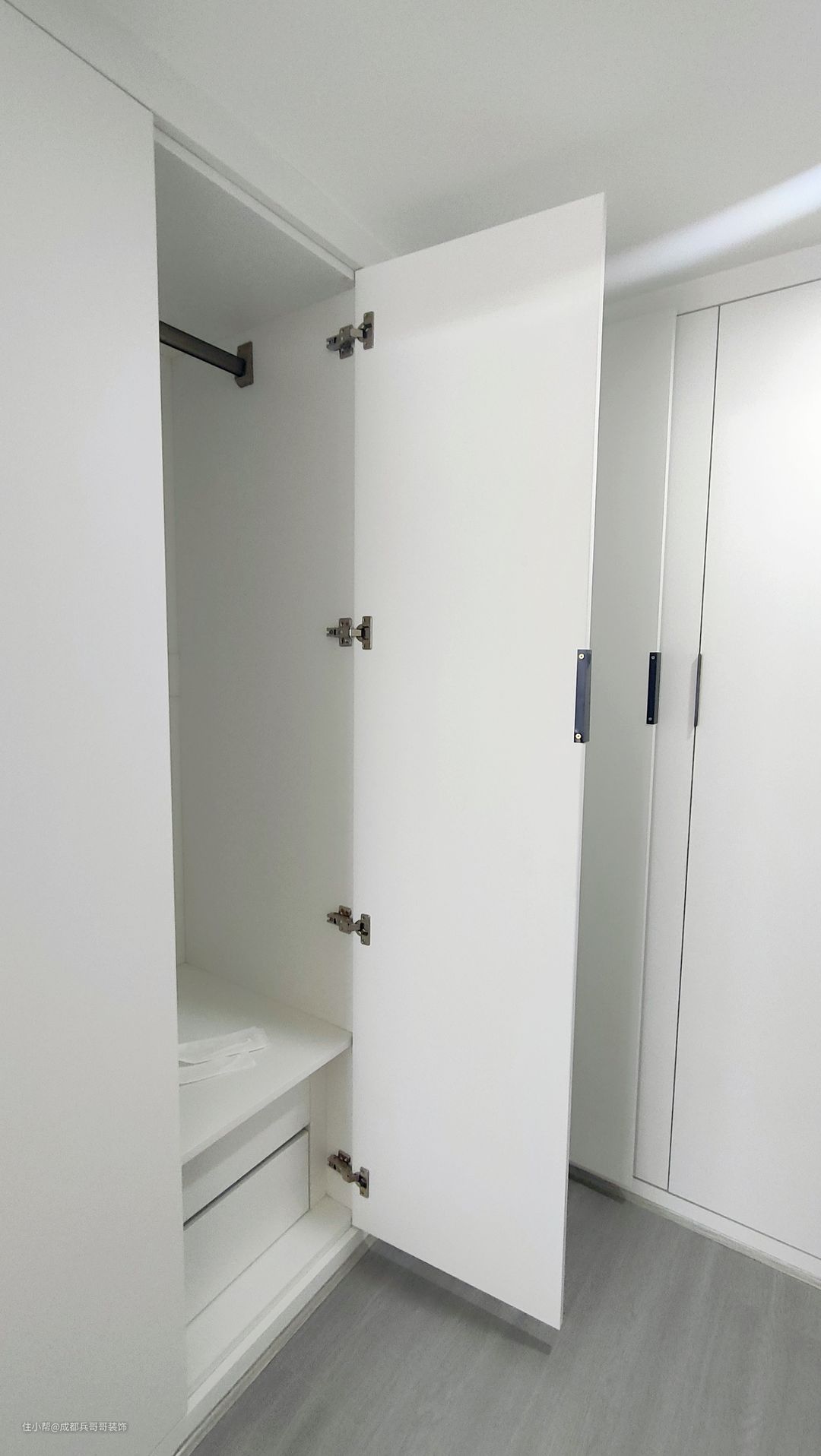 主卧衣帽间,小型L形通顶式衣柜,刻意储放四季衣物被褥,收纳空间足够。柜门简约白设计,与整体风格相呼应。