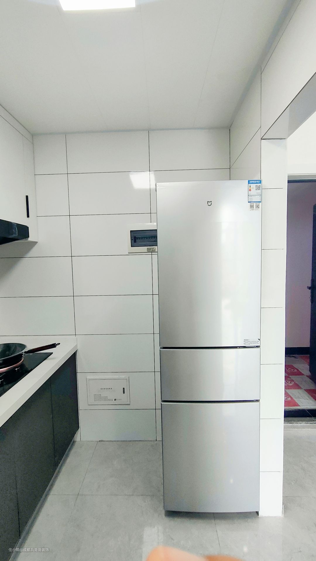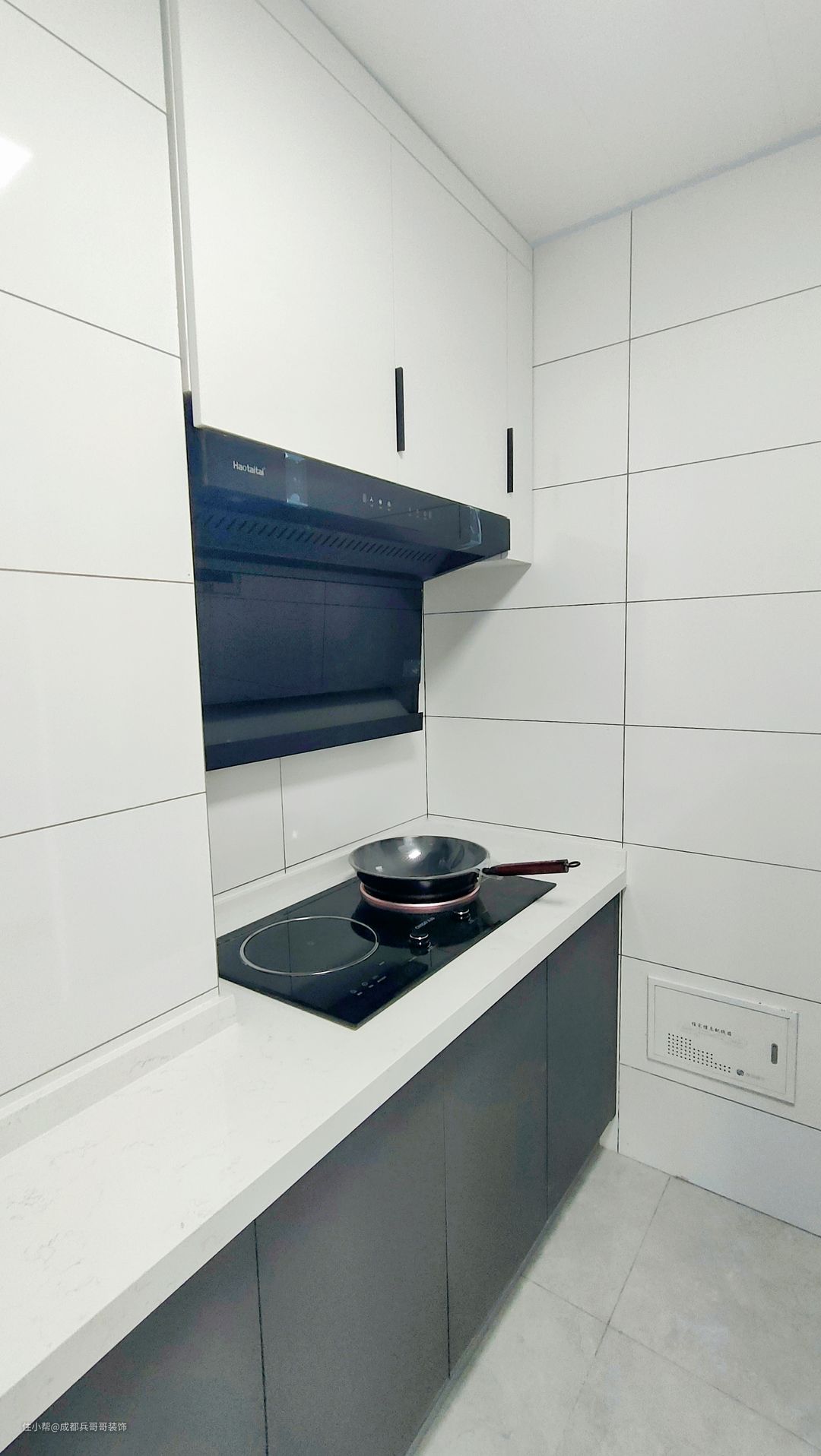 厨房,开放式、封闭式都可以设计,内部是L形布局,一整排地柜增加储物。没有做吊柜,空间感更大,只是吸油烟机管道那里做了吊柜,看上去更好看一些。厨房放置了单开门冰箱,空间更好用,不用因为家具而显得拥挤。
