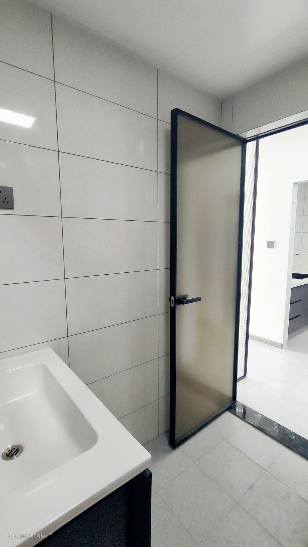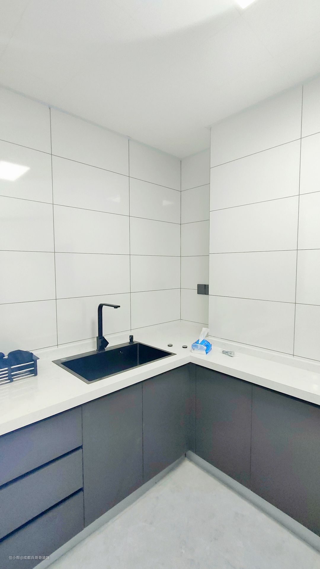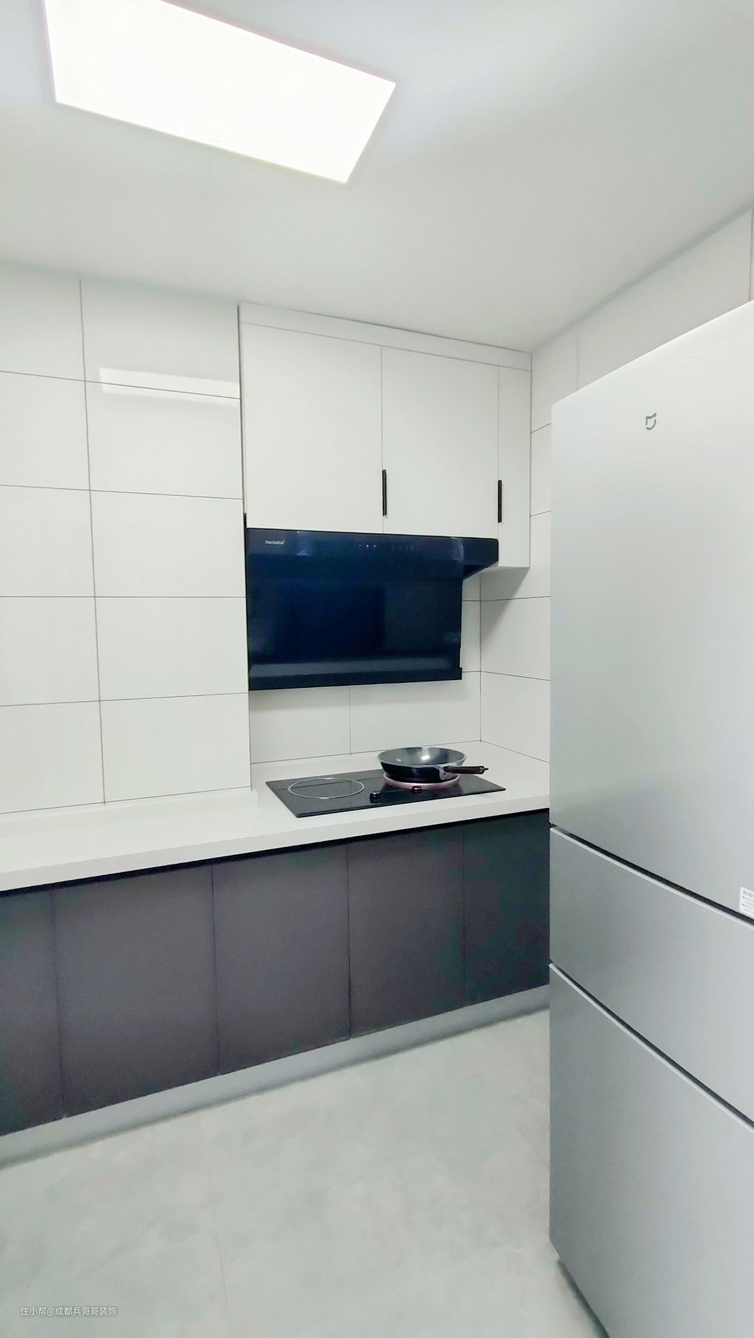 厨房,开放式、封闭式都可以设计,内部是L形布局,一整排地柜增加储物。没有做吊柜,空间感更大,只是吸油烟机管道那里做了吊柜,看上去更好看一些。厨房放置了单开门冰箱,空间更好用,不用因为家具而显得拥挤。