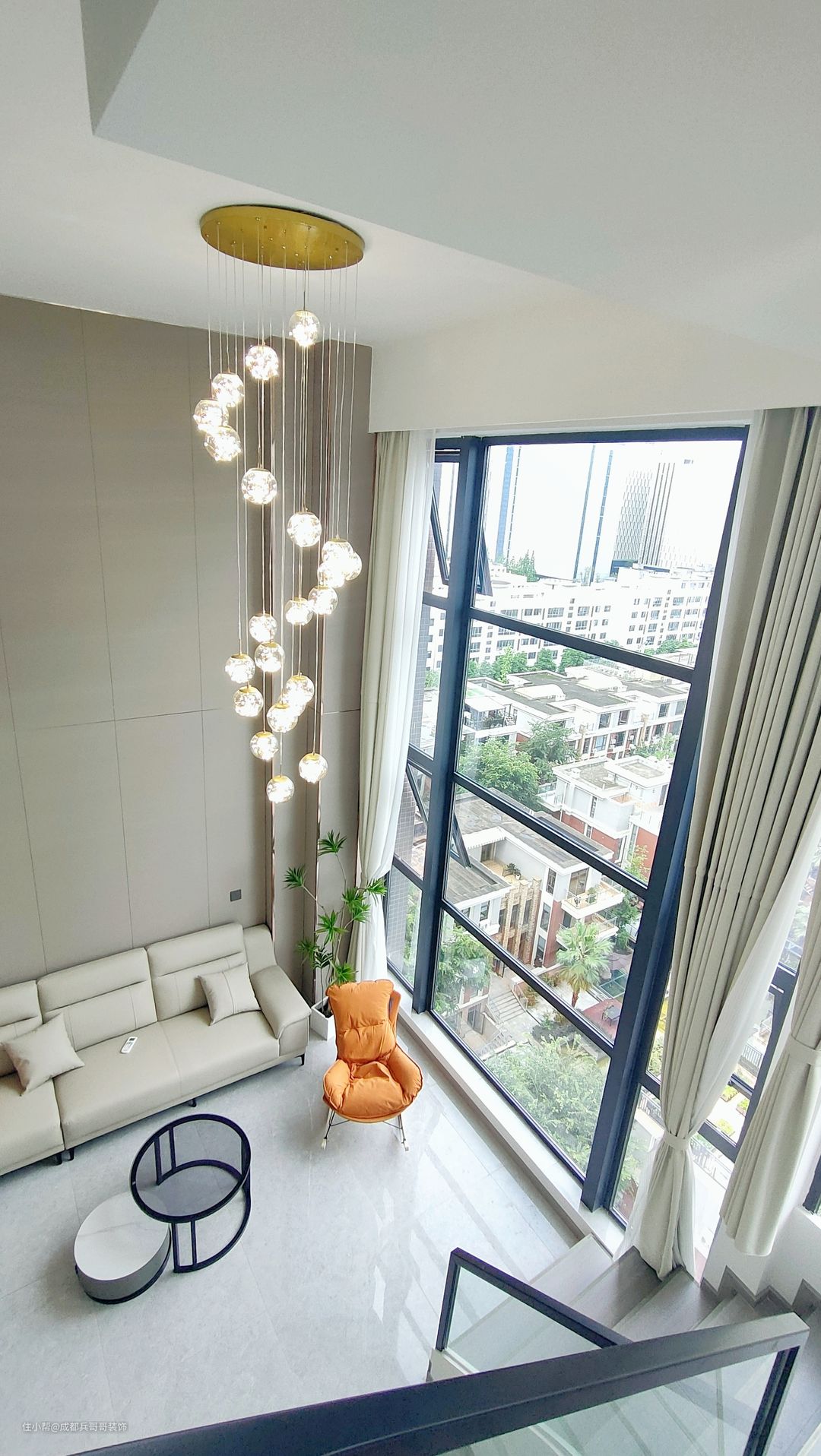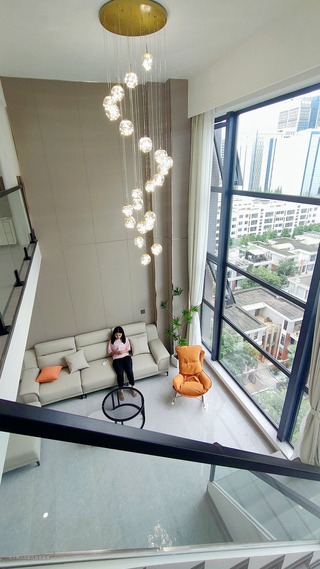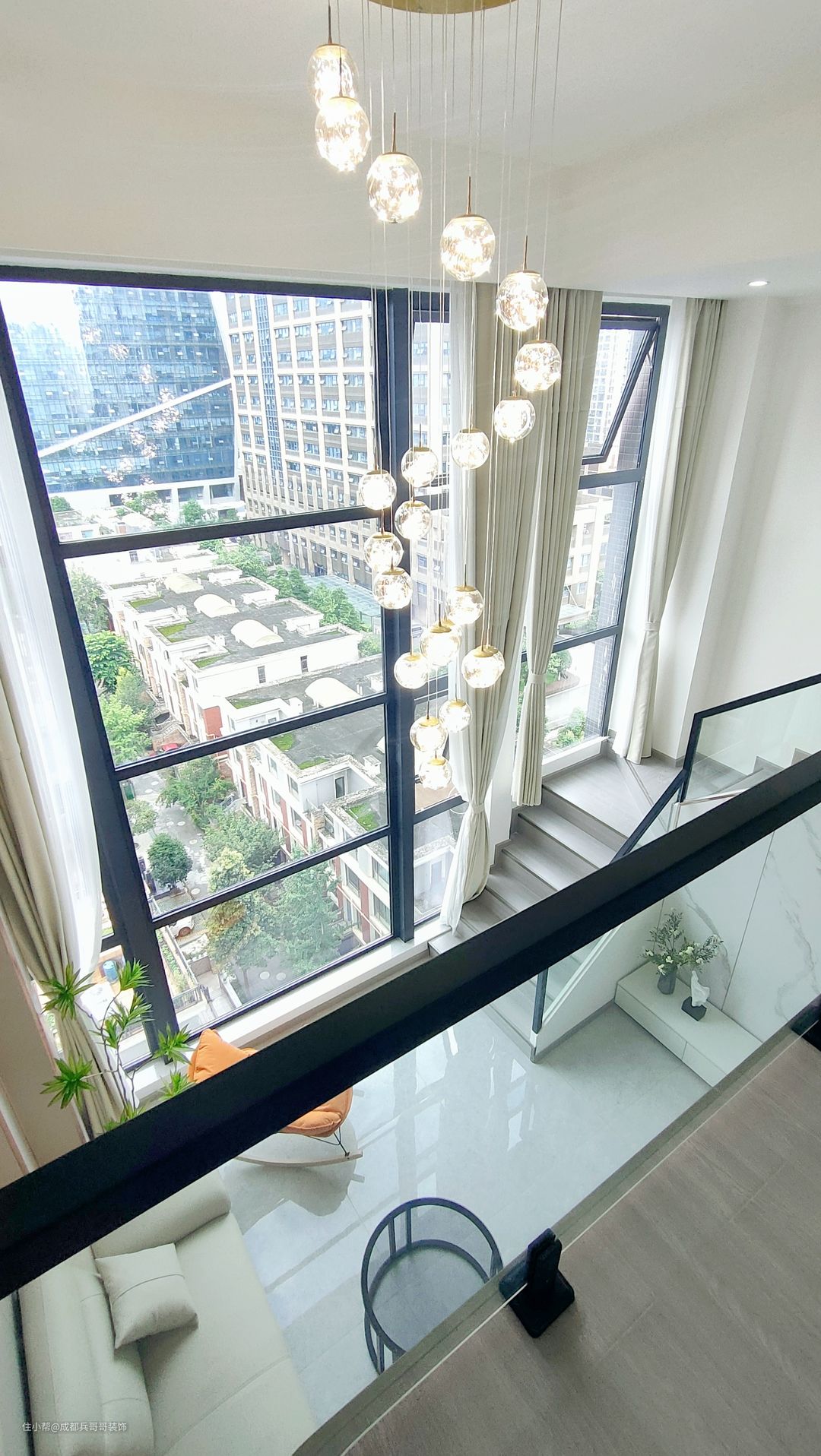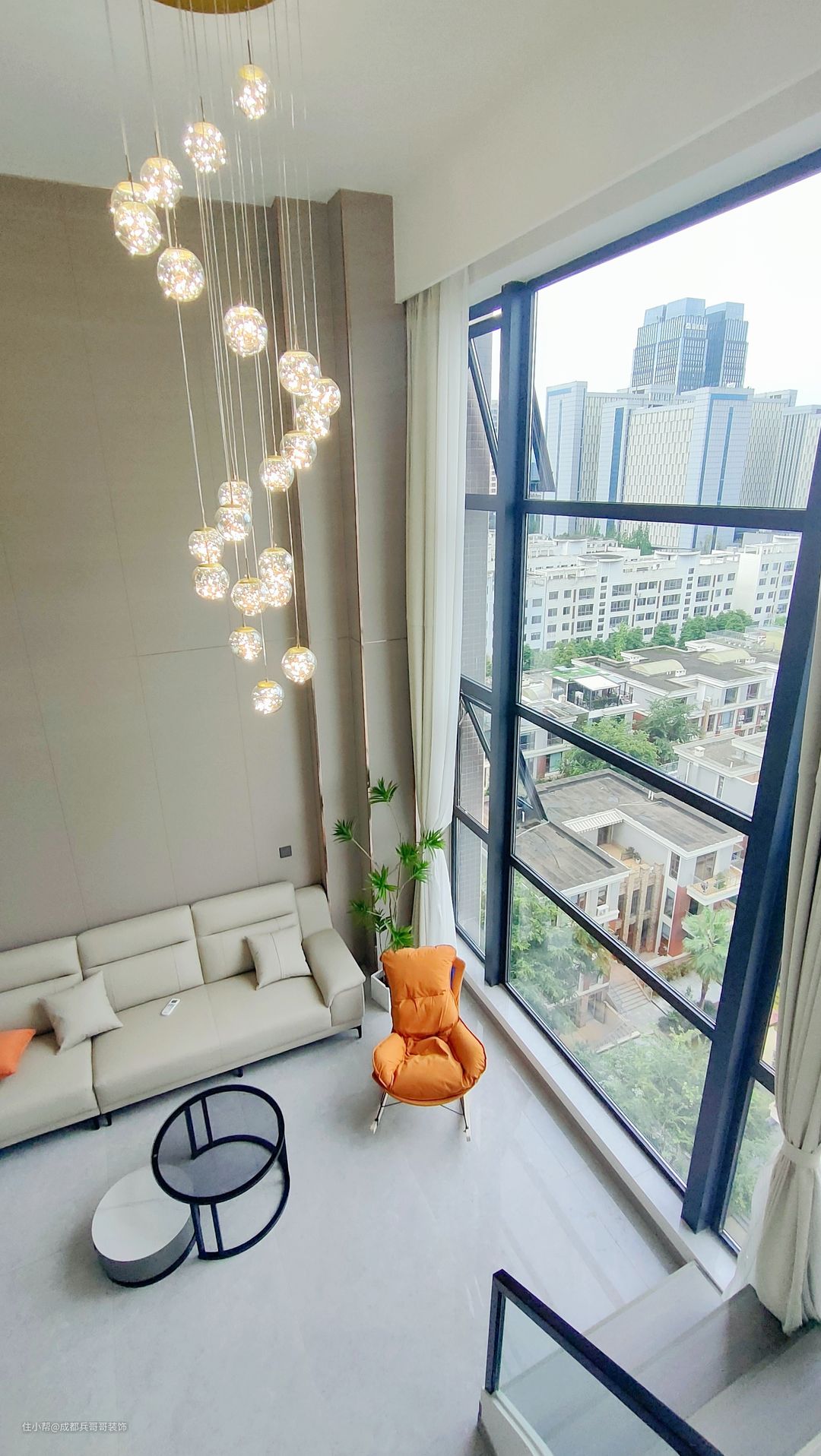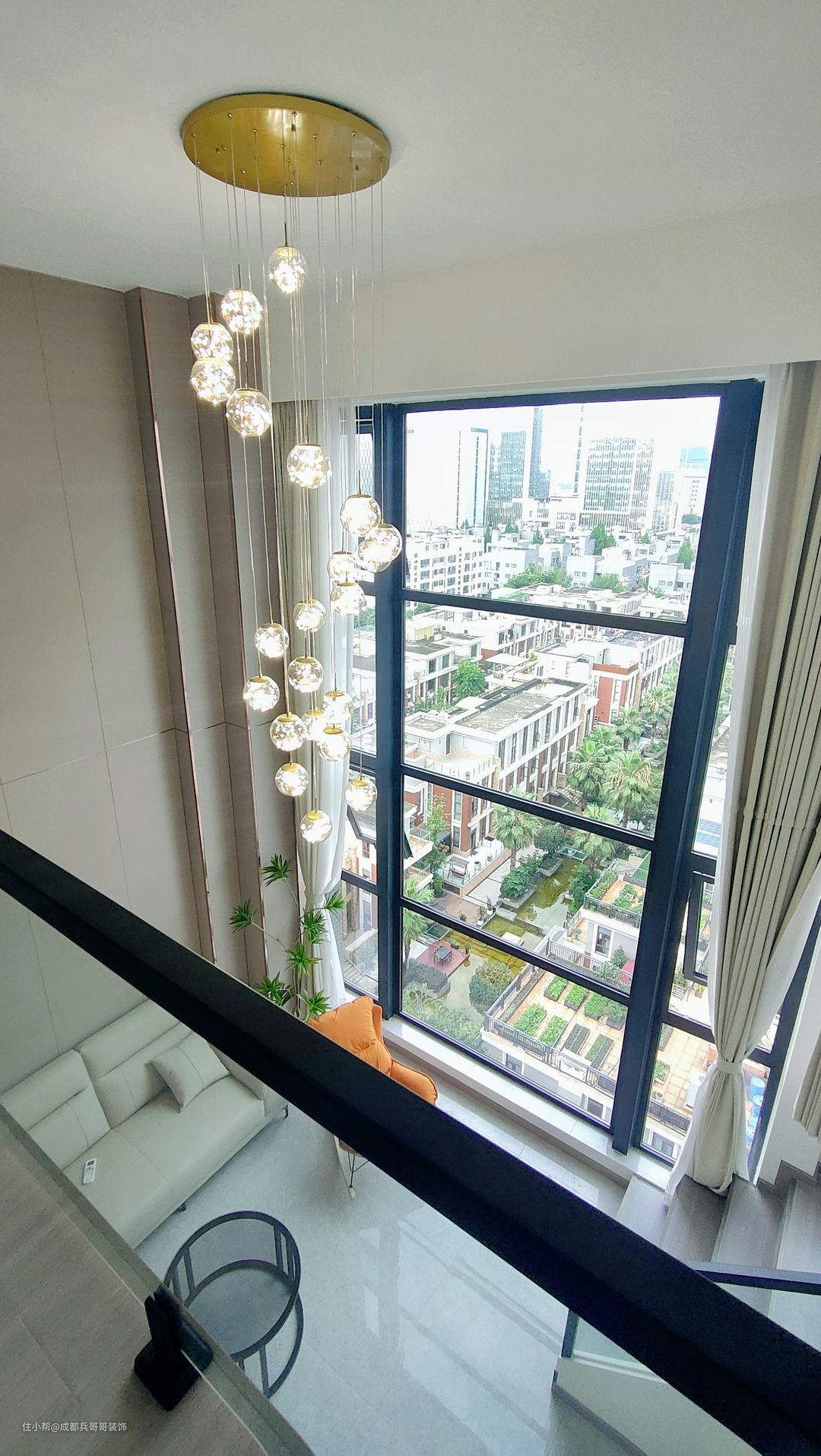 经过设计,公寓拥有5米多的挑空区域,保留全景窗户,12楼看窗外的城市景色别有一番风味呢~ 屋主自己选购的吊灯,很有品位,与整体风格也很搭,营造出浪漫、温馨的氛围感……