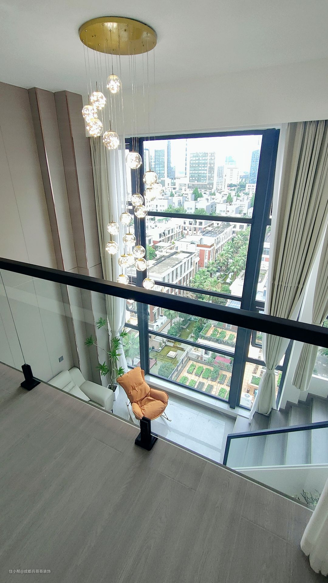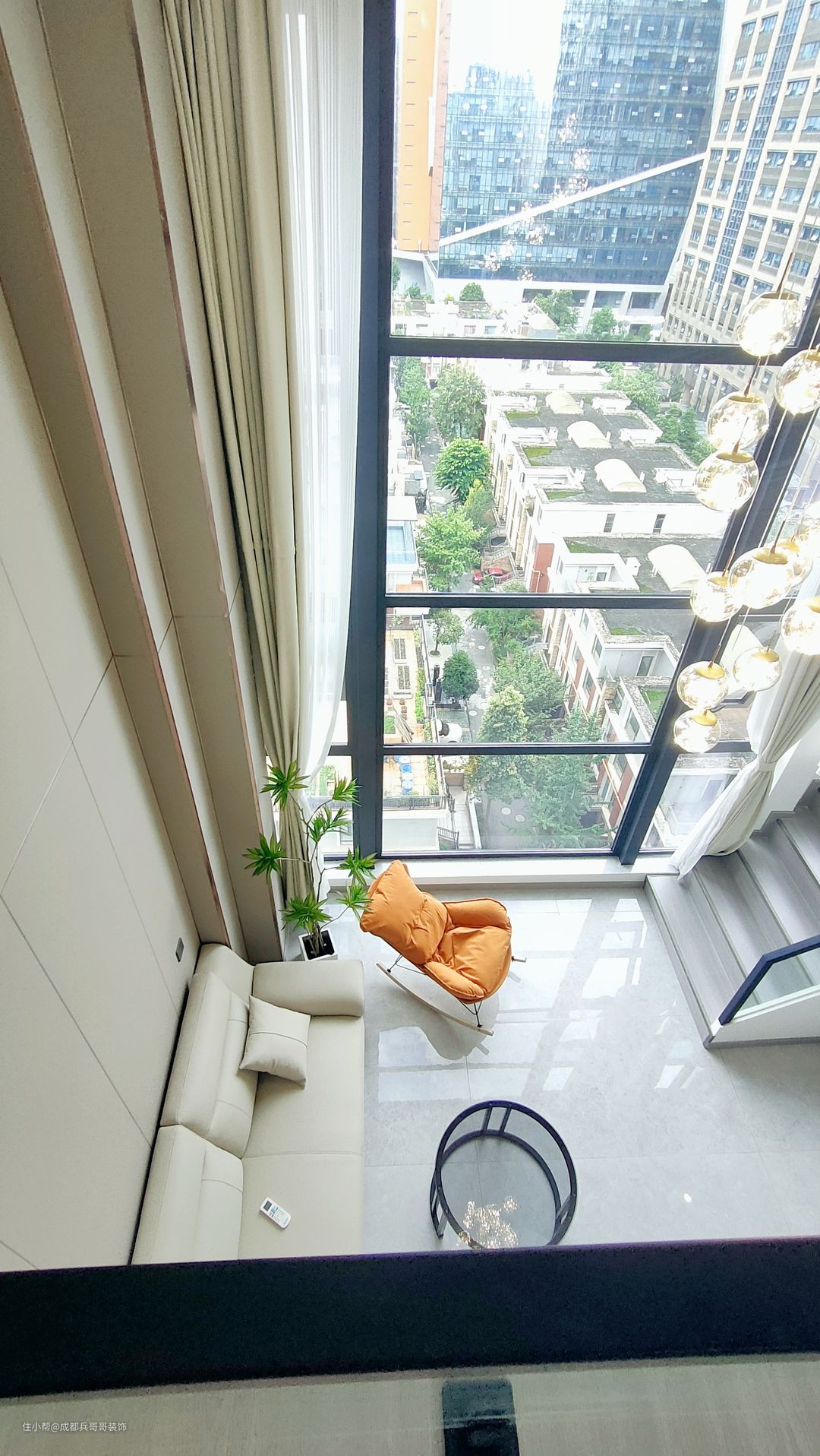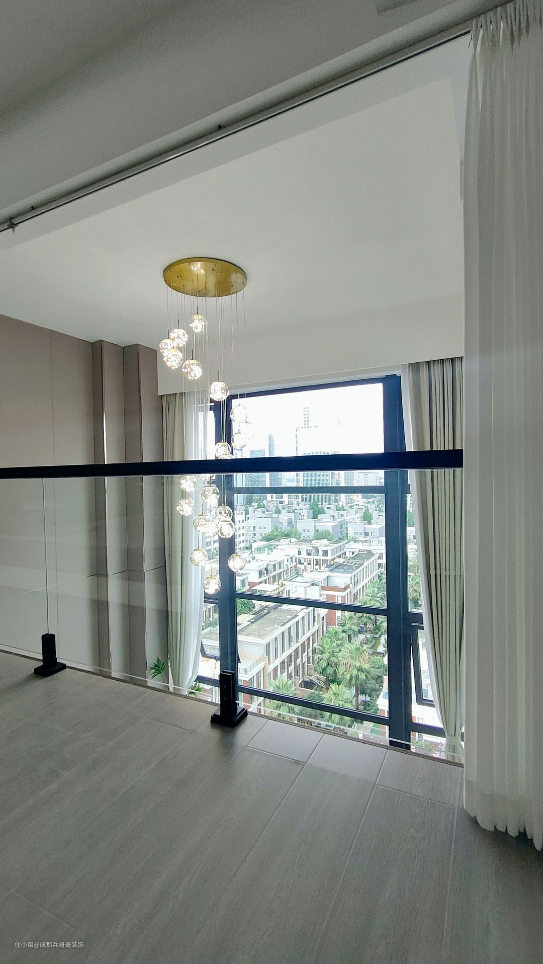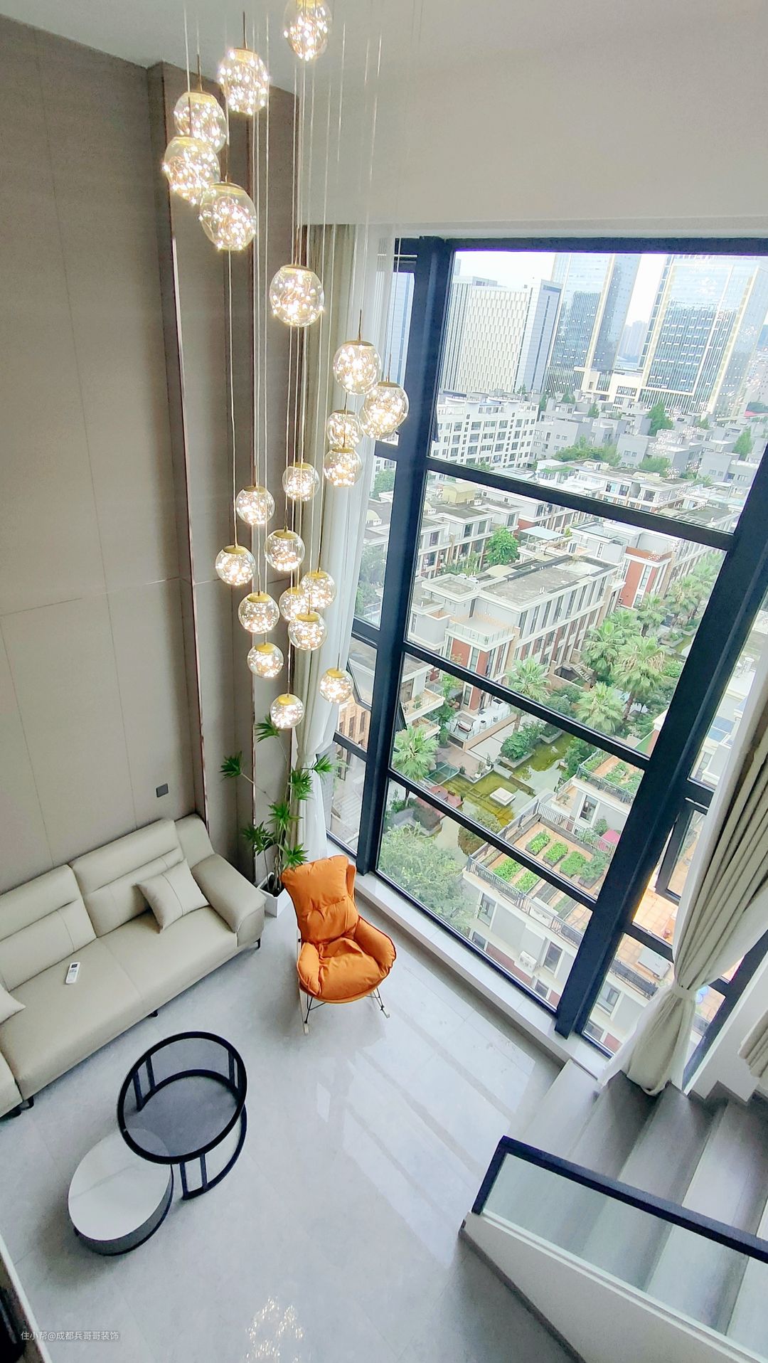 经过设计,公寓拥有5米多的挑空区域,保留全景窗户,12楼看窗外的城市景色别有一番风味呢~ 屋主自己选购的吊灯,很有品位,与整体风格也很搭,营造出浪漫、温馨的氛围感……