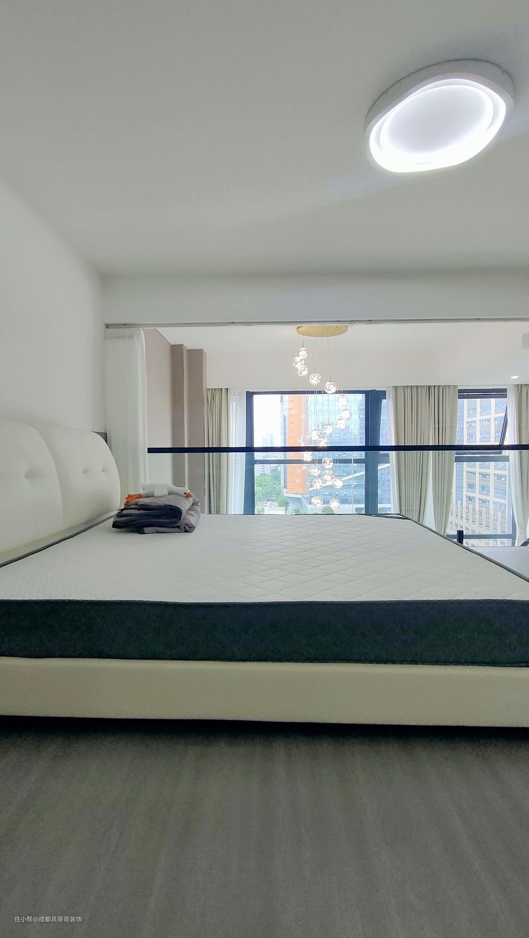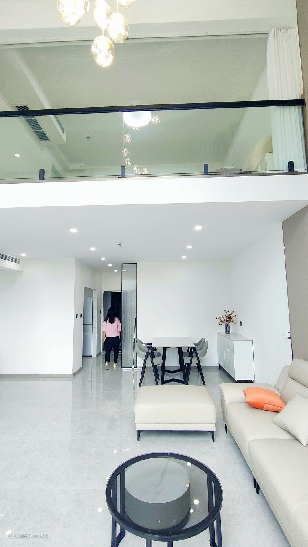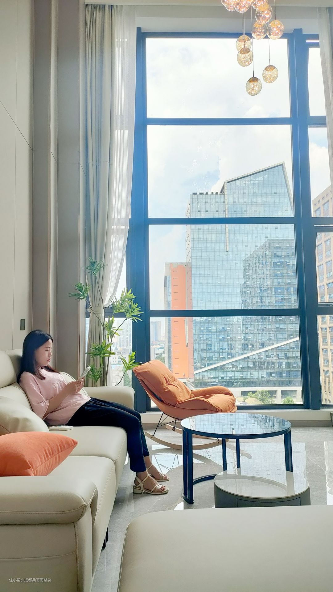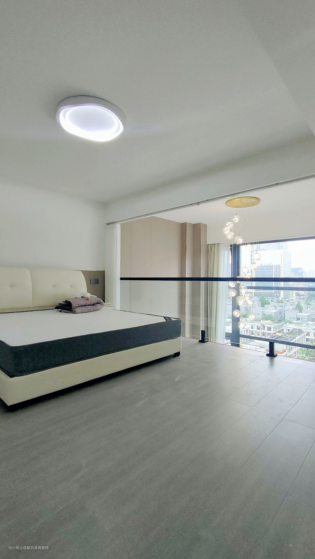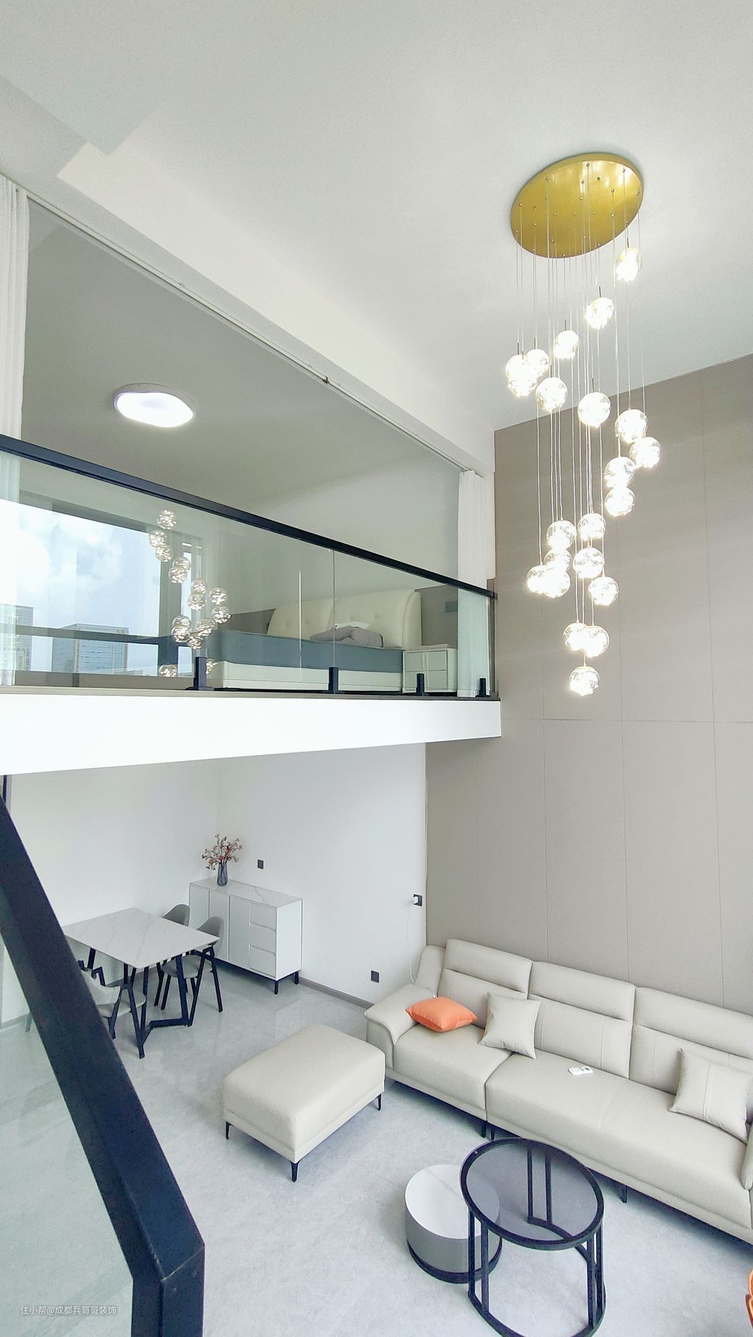 经过设计,公寓拥有5米多的挑空区域,保留全景窗户,12楼看窗外的城市景色别有一番风味呢~ 屋主自己选购的吊灯,很有品位,与整体风格也很搭,营造出浪漫、温馨的氛围感……