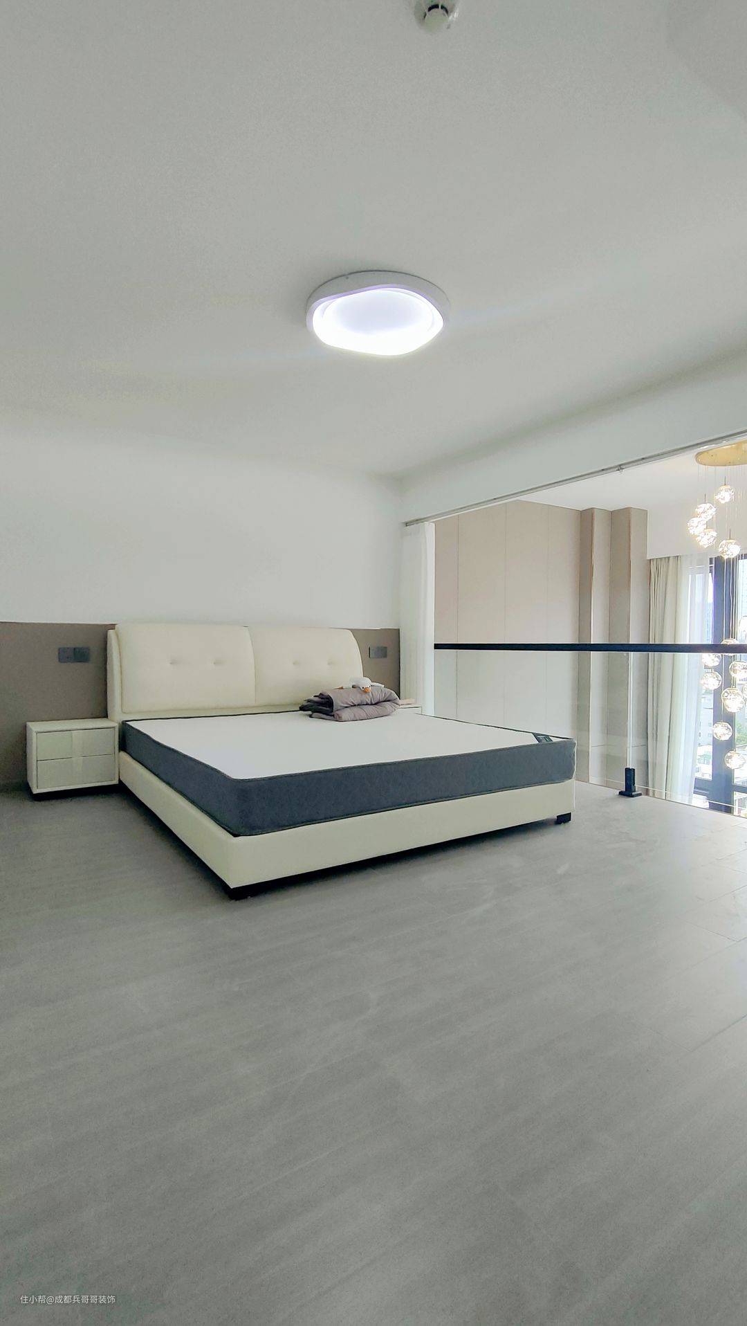 主卧,套房式设计,放置了一米八的双人床+两个床头柜,深咖色木地板+白色乳胶漆上墙,空间感简约耐看、又十分自然…… 主卧侧边没有砌墙起来,而是安装的半高玻璃扶手+窗帘,空间通透感更好。闲暇时也可以看看挑空区域外的风景,一举两得……