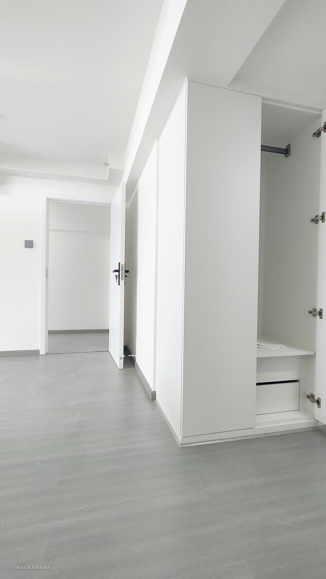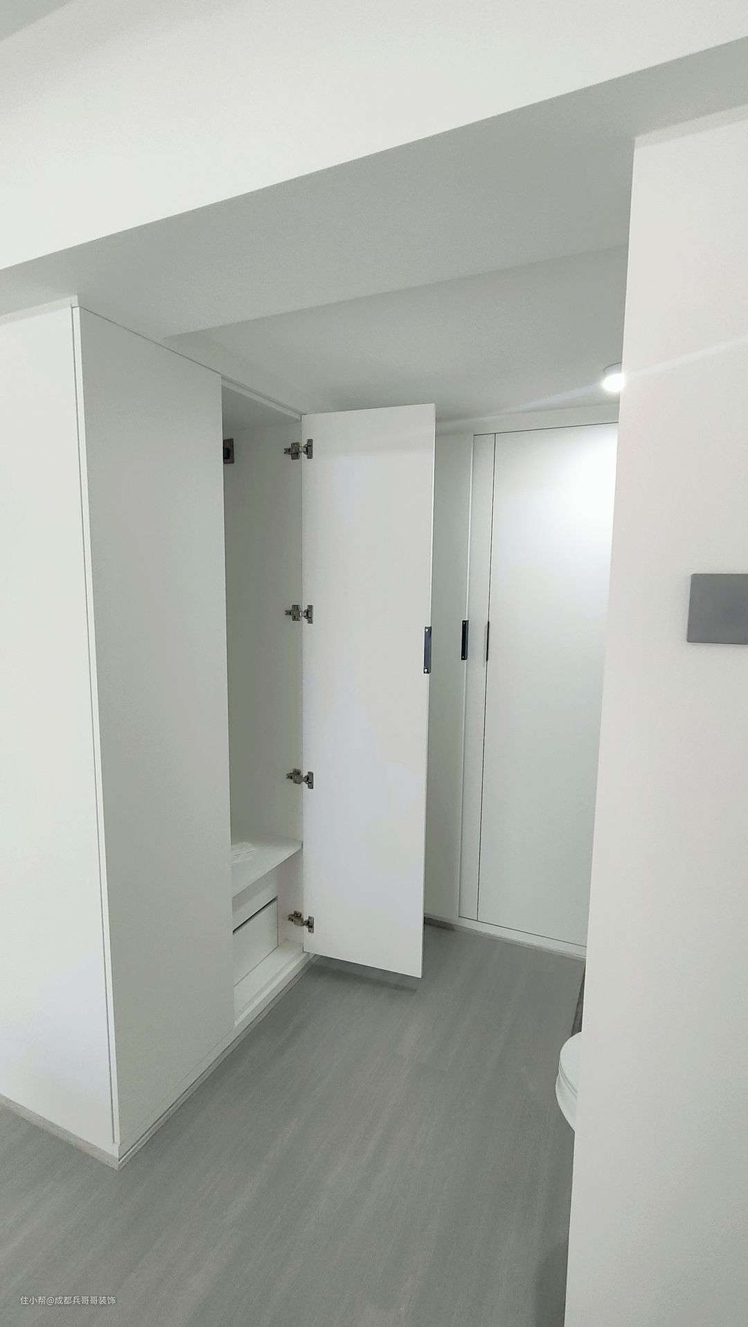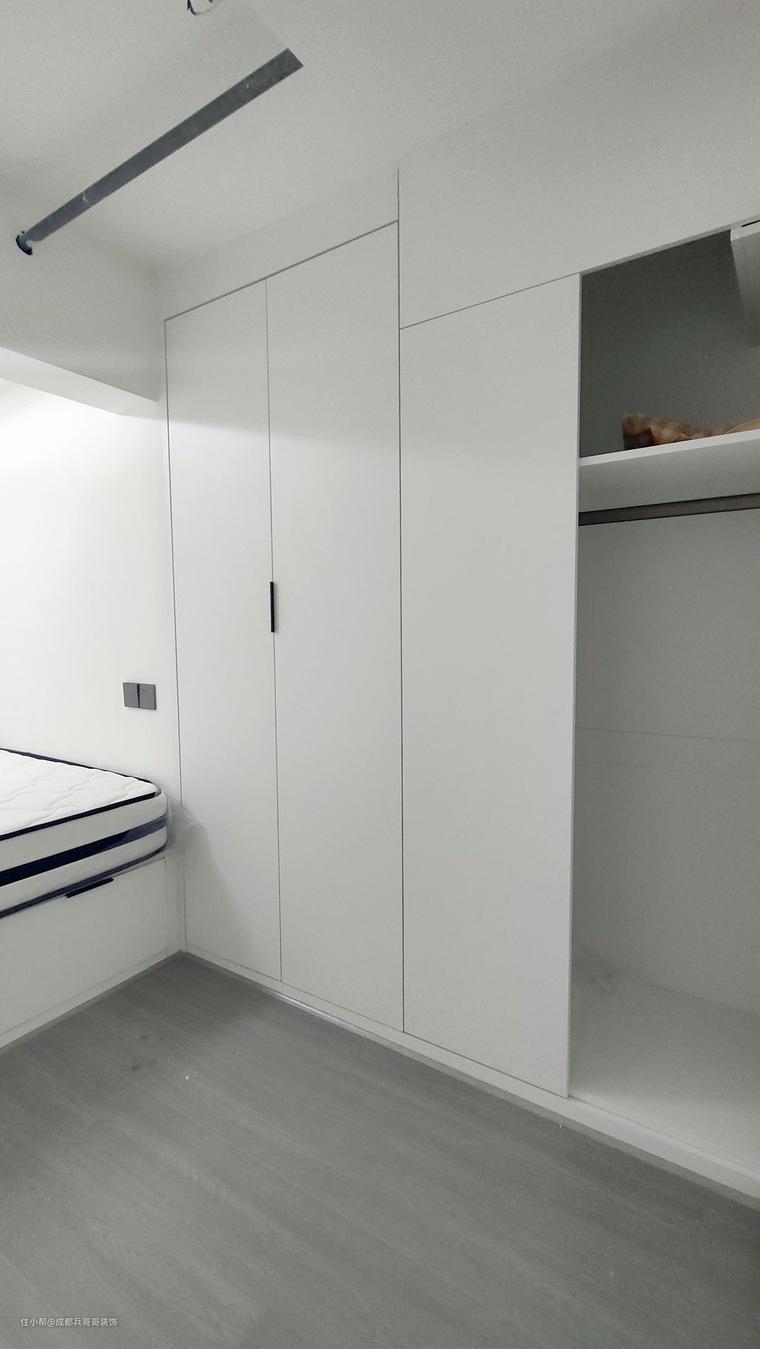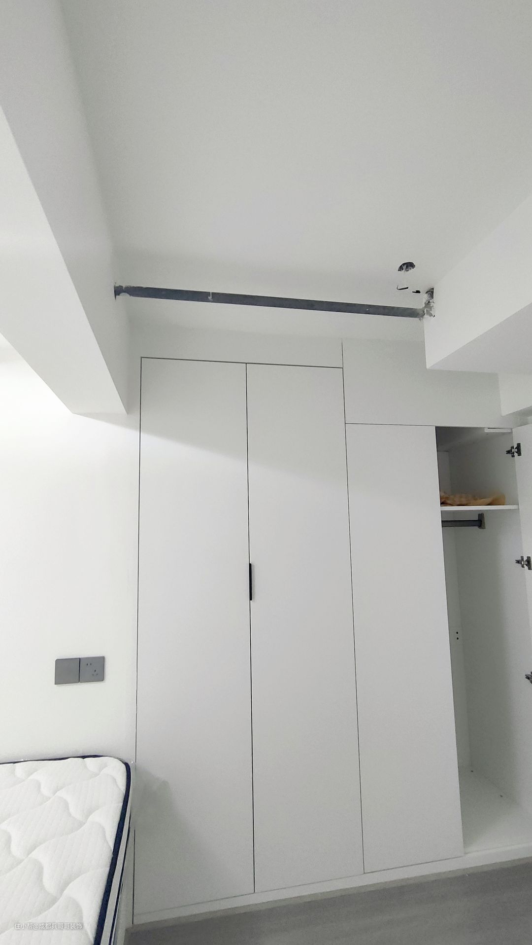 主卧衣帽间,小型L形通顶式衣柜,刻意储放四季衣物被褥,收纳空间足够。柜门简约白设计,与整体风格相呼应。