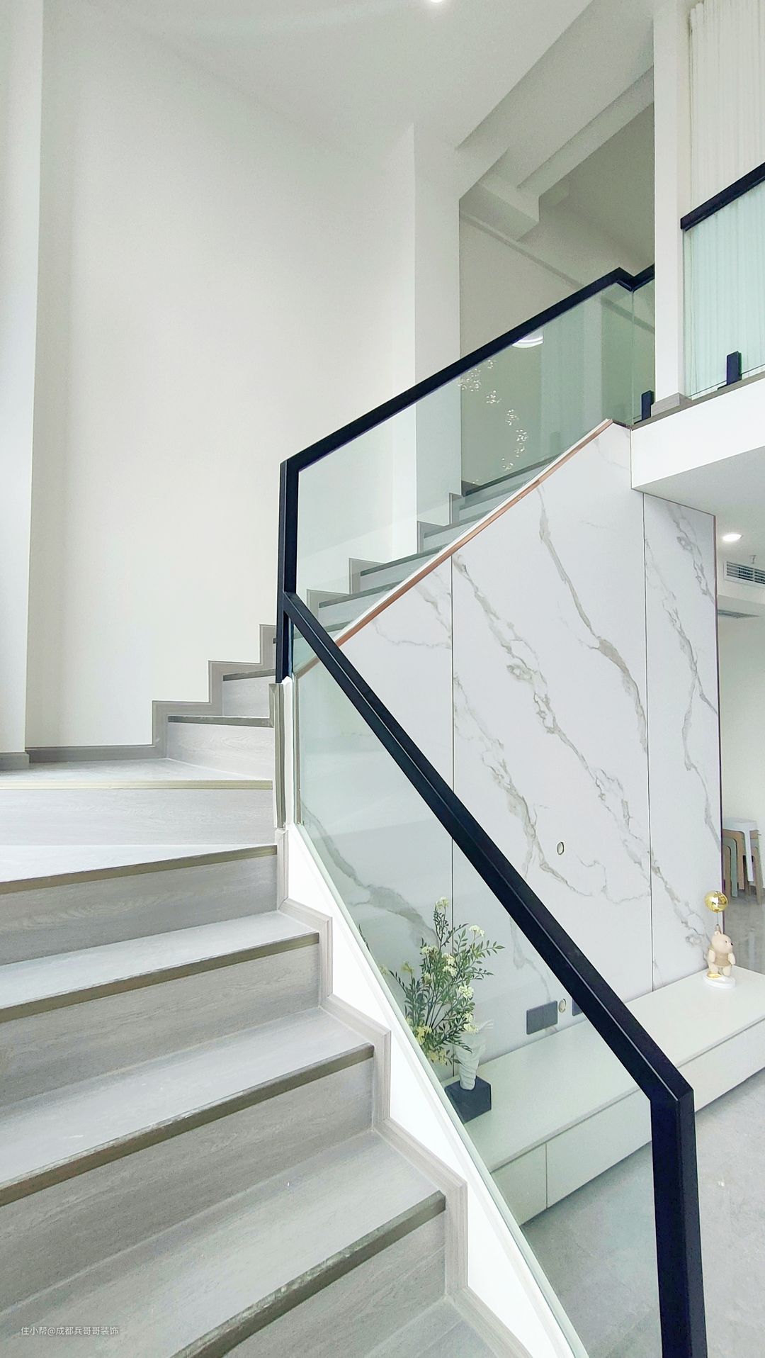 这套公寓楼梯选用7字形楼梯,楼梯下方做储物间,空调外机放在里面,看上去更美观。楼梯采用木地板踏步+实木玻璃扶手,简约大气。楼梯尺寸:长*宽*高——1.1m*0.23m*0.20m,根据常住人口身高设计,上下楼梯更舒适……