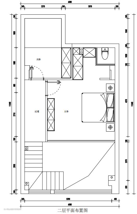二楼过道,有一米多宽,分别通往主卧和次卧。