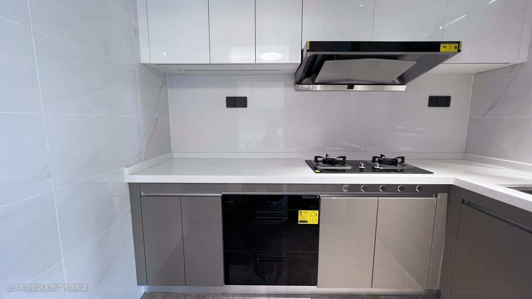 ①这是一个颜值很高的L型厨房,吊柜和橱柜都采用了亮面柜门板,不仅光泽好,还方便清理 ②女主人很喜欢下厨,为了避免油烟外散,安装了吊轨玻璃门,超白玻璃洁净还透亮 ③厨房的天花板根据烹饪时的站位安装了筒灯,还在吊柜底部内嵌了灯带,能确保下厨时每个操作都能得到充分的照明。且内嵌感应灯带不占空间,还很方便 ④橱柜底柜的柜门与地面保持5cm的距离,避免开柜子时造成摩擦,增强耐用度