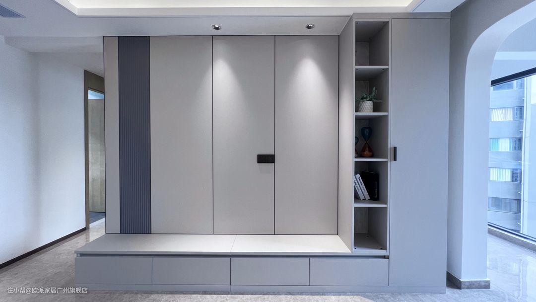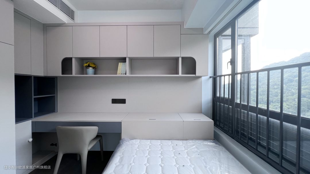 主卧靠墙处定制了长达5m的定制柜,黑玻璃柜+米色封闭柜的搭配,一深一浅。业主曾担心玻璃柜会把衣柜里的丑态尽露,但是玻璃背后都是挂衣区,就能避免看到不整齐的衣物,更何况黑玻璃使柜子内部看起来不是那么明显。 最左边的开放格定制了造型柜门,使开放格呈可爱的椭圆形,丰富了柜面设计。最右侧是书桌区,与衣柜相连的一体化设计,让空间利用更加合理。