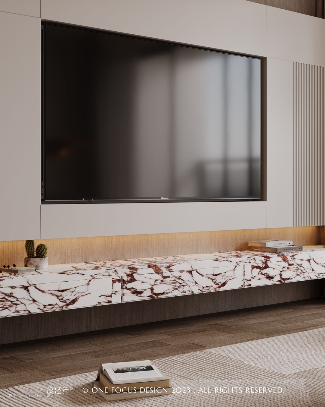 客厅中,设计师选用了白色烤漆板、木饰面搭配大理石与格栅元素的电视背景墙,控黑出色立体通透的海信液晶电视一体贴墙,家居艺术的零贴墙壁画设计;16bits感控环境光MiniLED,正看侧看光色都不变,信芯X感知芯片,感知影像,重塑细节;3.1.2多声道空间声场四面发声,澎湃音浪;显得整个空间层次丰富且立体逼真。给空间增加了生动的自然气息,营造了现代侘寂住宅的雅致感。