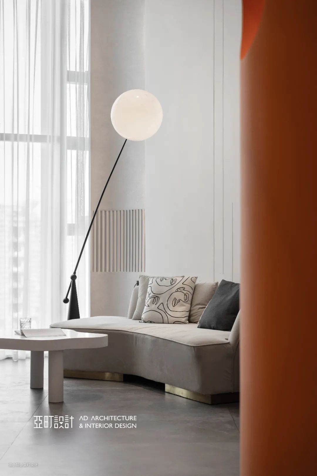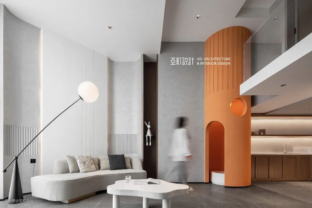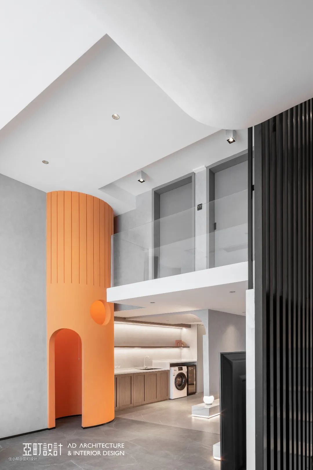 客厅空间的穿插和转折突显了色彩的真诚热情。在具象化的场景中,建构出新的游乐场景,让每个色彩都充分得到尊重,满足人们对未知的想象,亦是新商业的游乐之趣。墙面隐藏的灯带让空间更加立体,蜿蜒的门洞打破了传统居所循规蹈矩的布局,使得小空间也变得富有探索感。