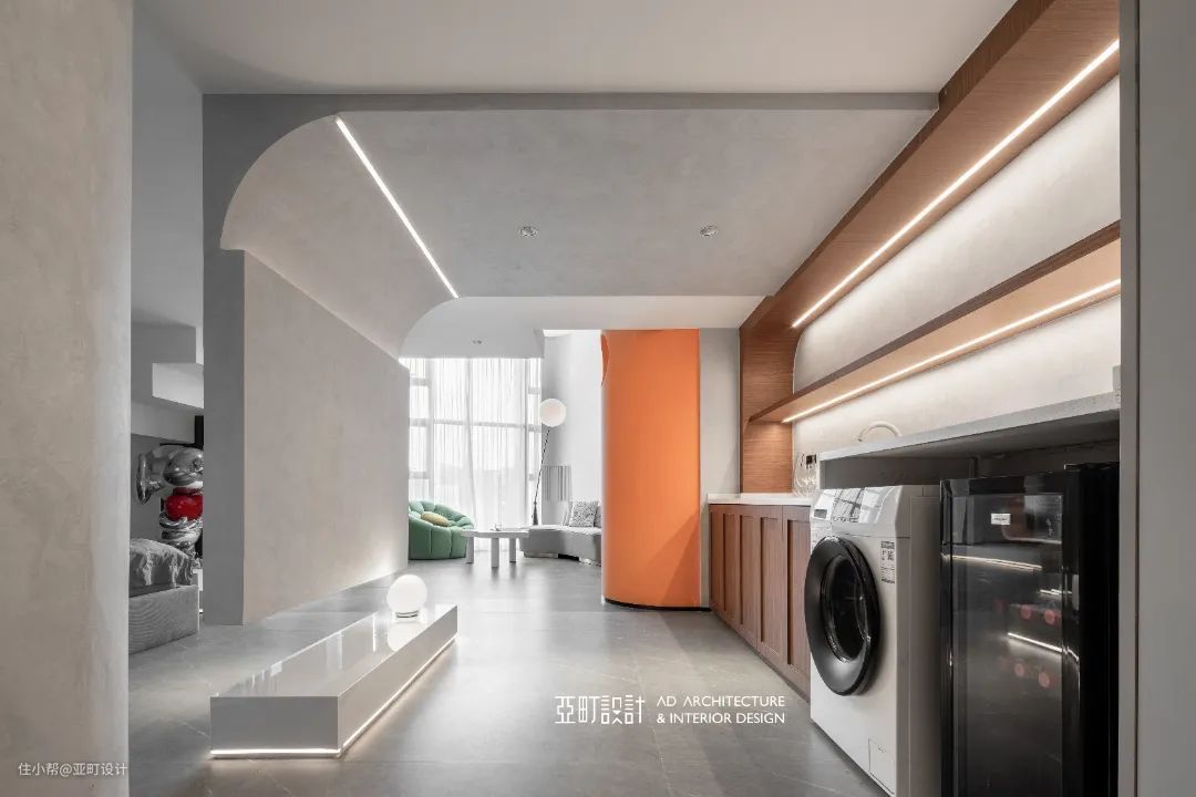 客厅空间的穿插和转折突显了色彩的真诚热情。在具象化的场景中,建构出新的游乐场景,让每个色彩都充分得到尊重,满足人们对未知的想象,亦是新商业的游乐之趣。墙面隐藏的灯带让空间更加立体,蜿蜒的门洞打破了传统居所循规蹈矩的布局,使得小空间也变得富有探索感。