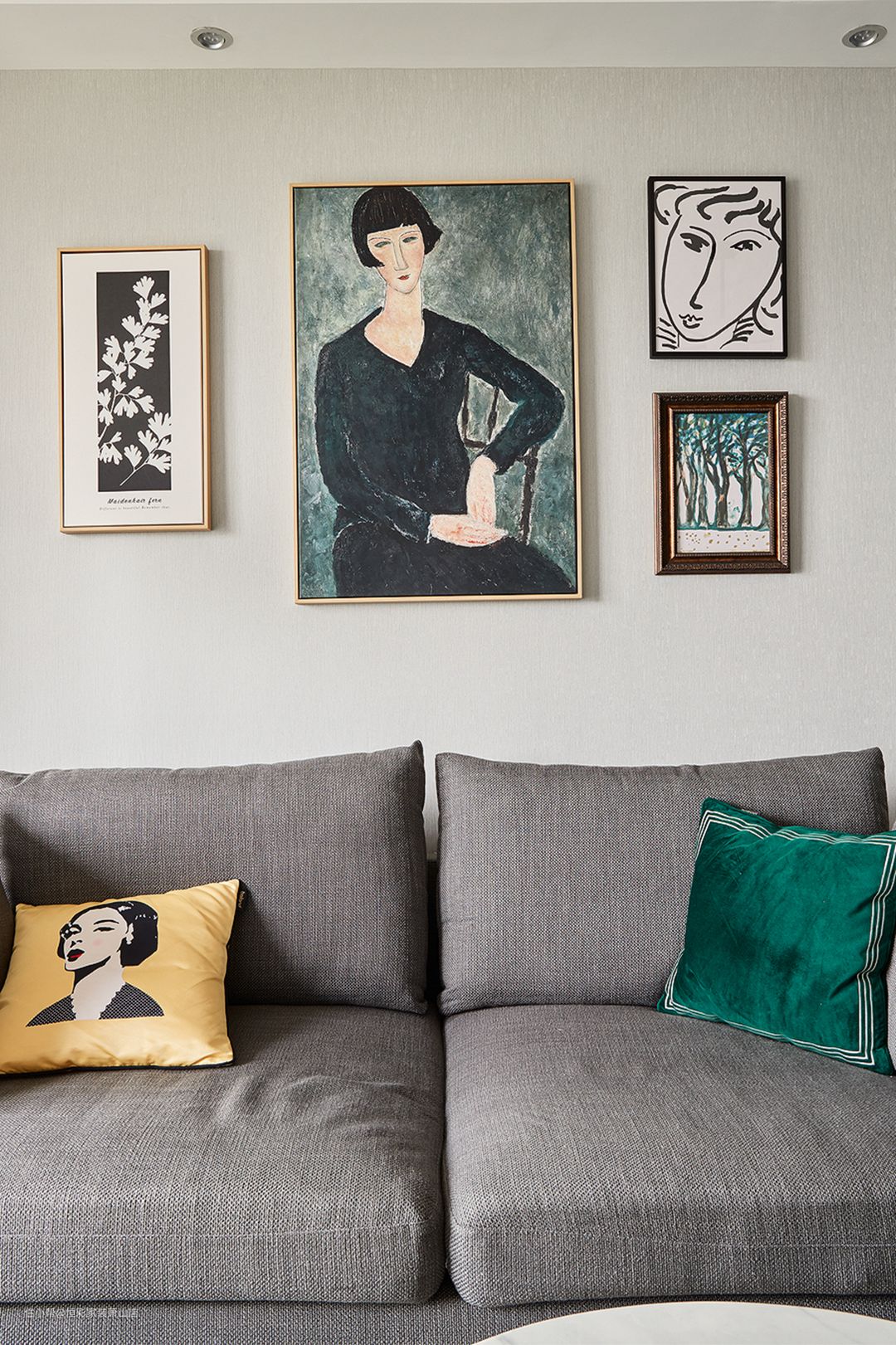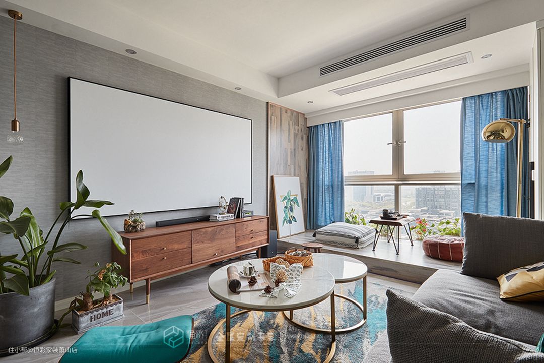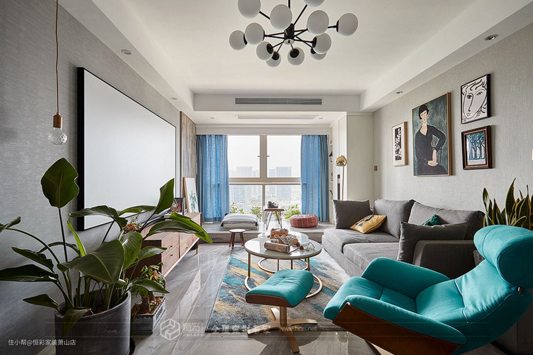 客厅选择选择,浅灰色电视机背景墙上的投影,一盏垂挂的吊灯和大小形态不一的绿植,自成风景。