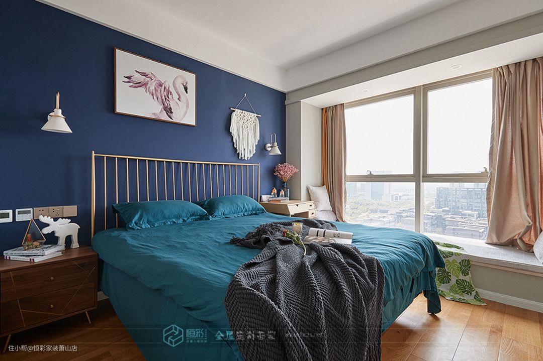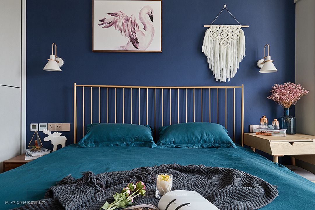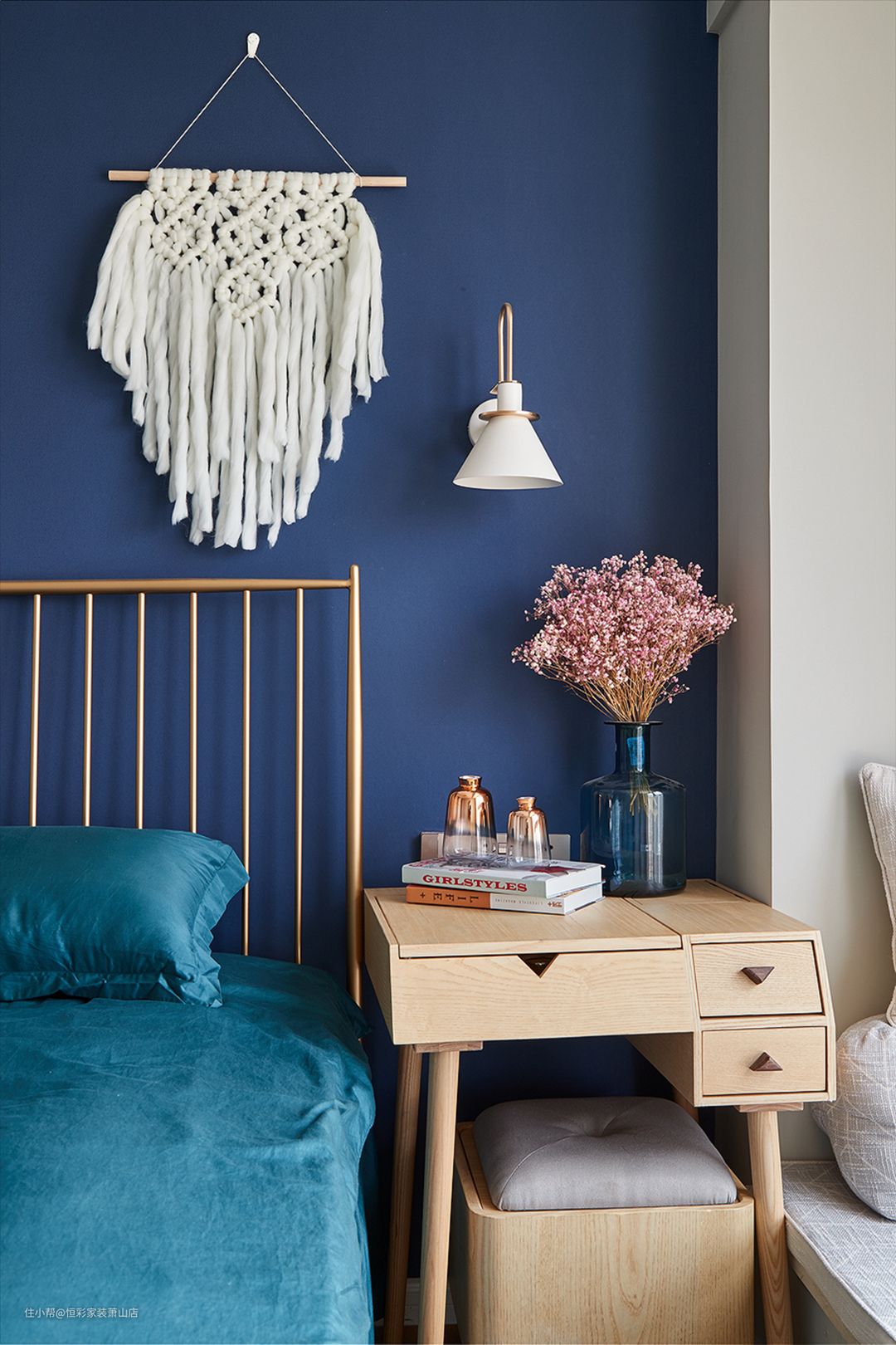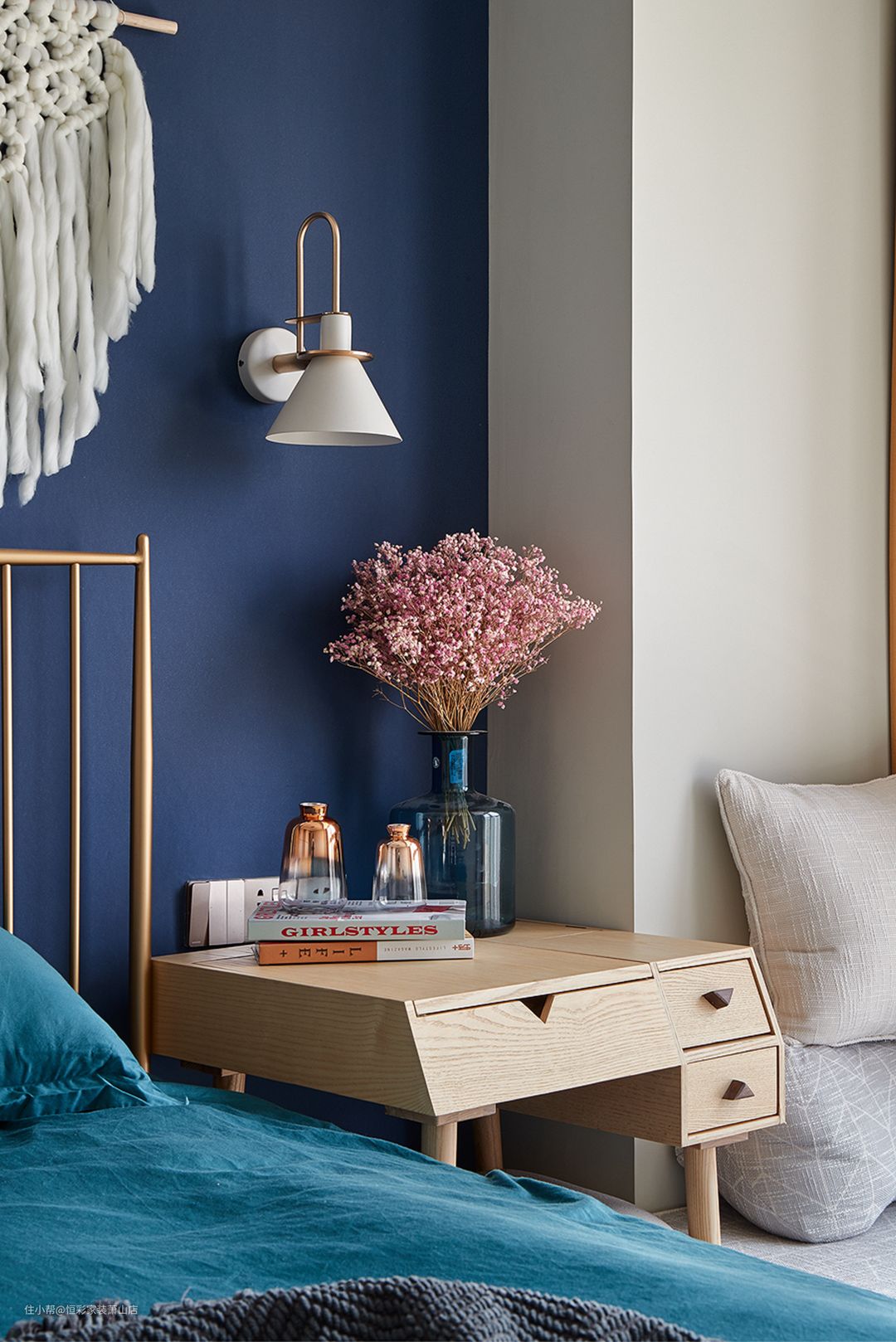 卧室正面墙采用宝石蓝色,床的金属元素和祖母绿的成套床单被套完美地结合,强烈的色彩撞击,白色的墙灯和白色布艺装饰品,看似简单不经意的搭配,却带来别具一格的视觉盛宴。
