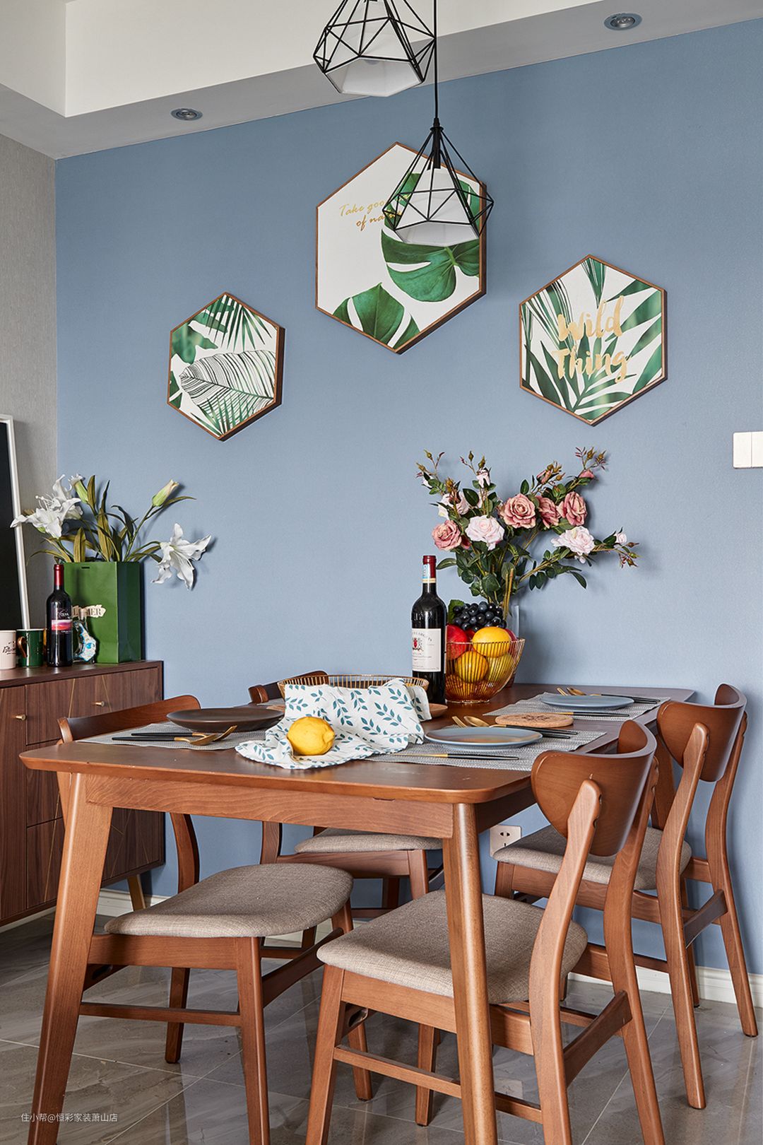 餐厅营造一股原始的自然气息,浅棕色木质餐桌椅,多边形的植物挂画,搭配餐桌、餐边柜上的花饰,清新的浅蓝灰色墙面,清爽宜人。