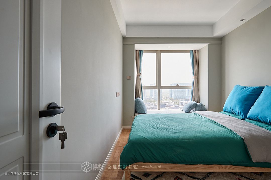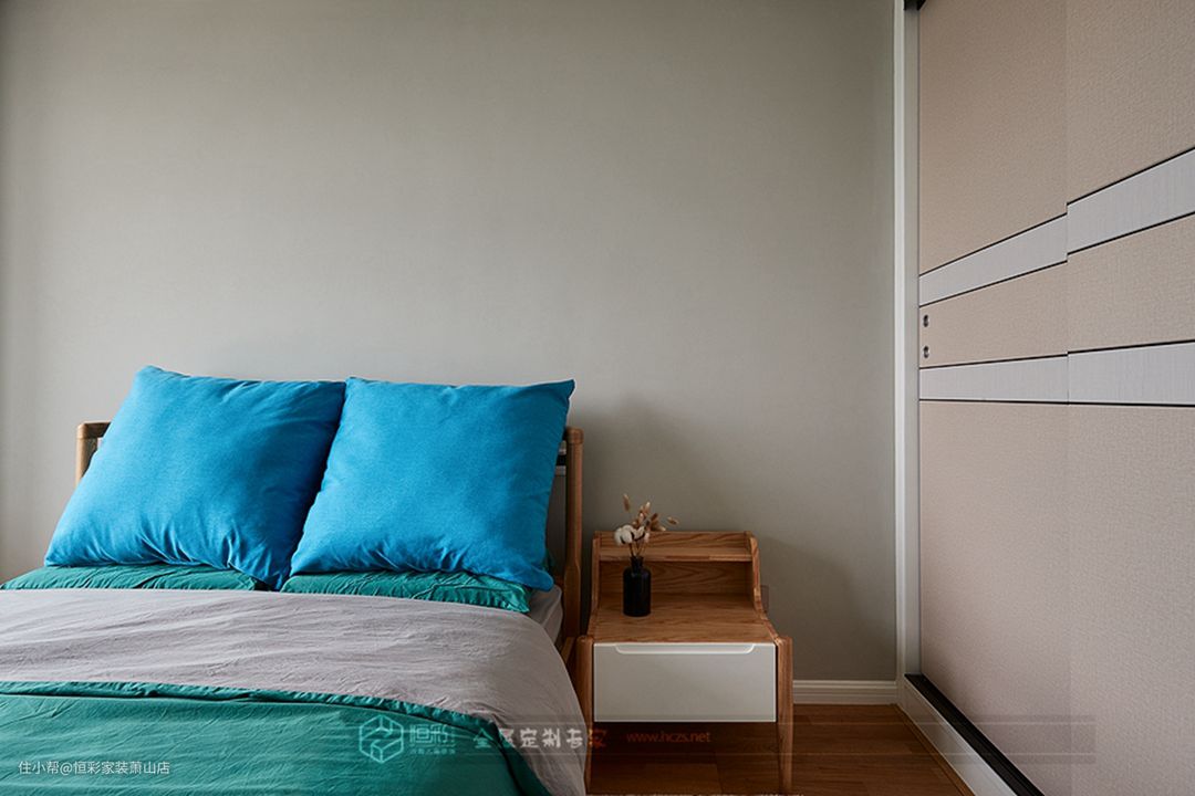 次卧硬装简洁干净,软装的则起到非常棒的装饰作用。祖母绿和宝石蓝色用色仍然是这个空间里的重心色。